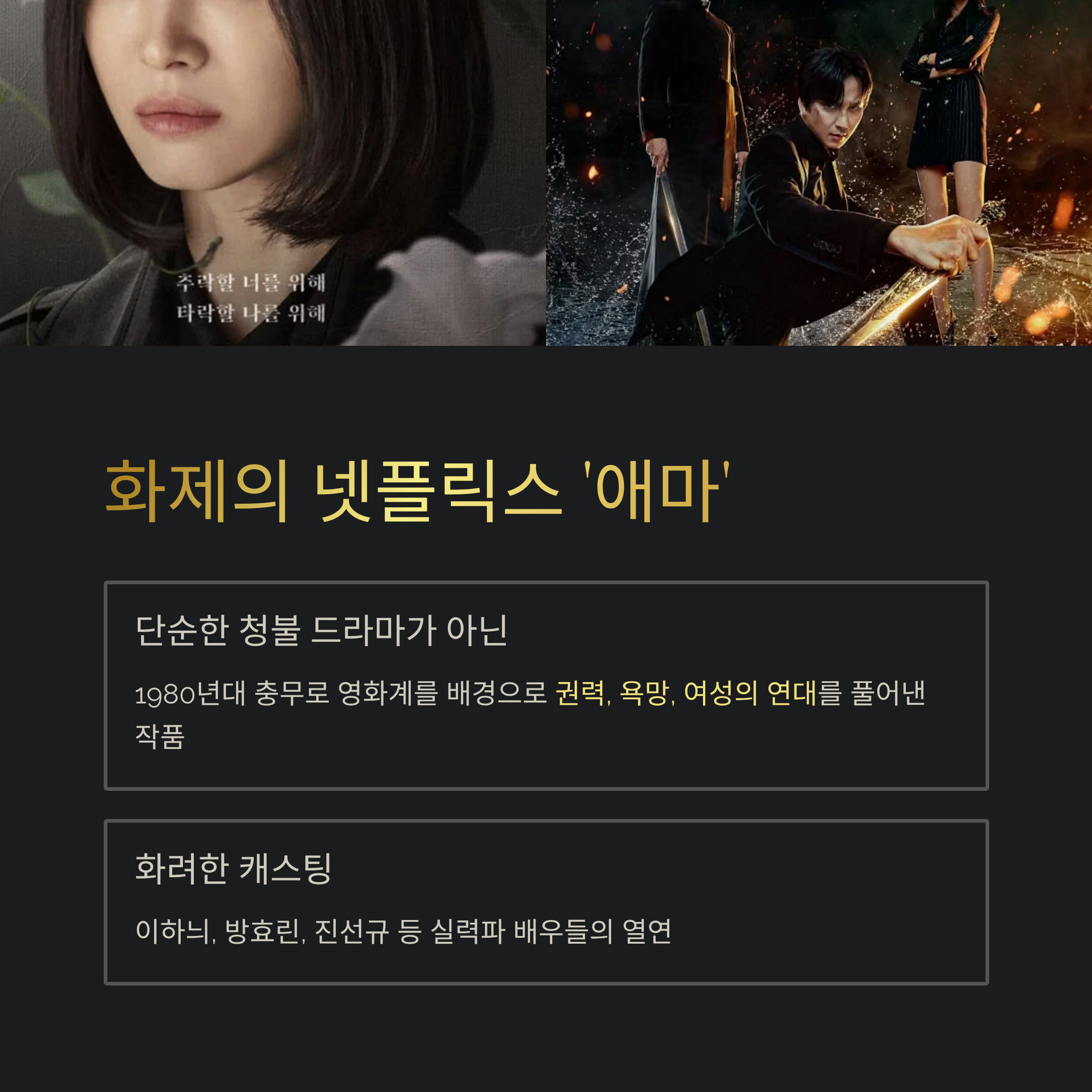 이 드라마는 단순히 '애마부인'의 리메이크가 아니라, 그 시대 속 '에로 영화' 제작 과정에서 벌어졌던 권력과 성, 그리고 여성의 생존 전략을 다룬 작품이에요.