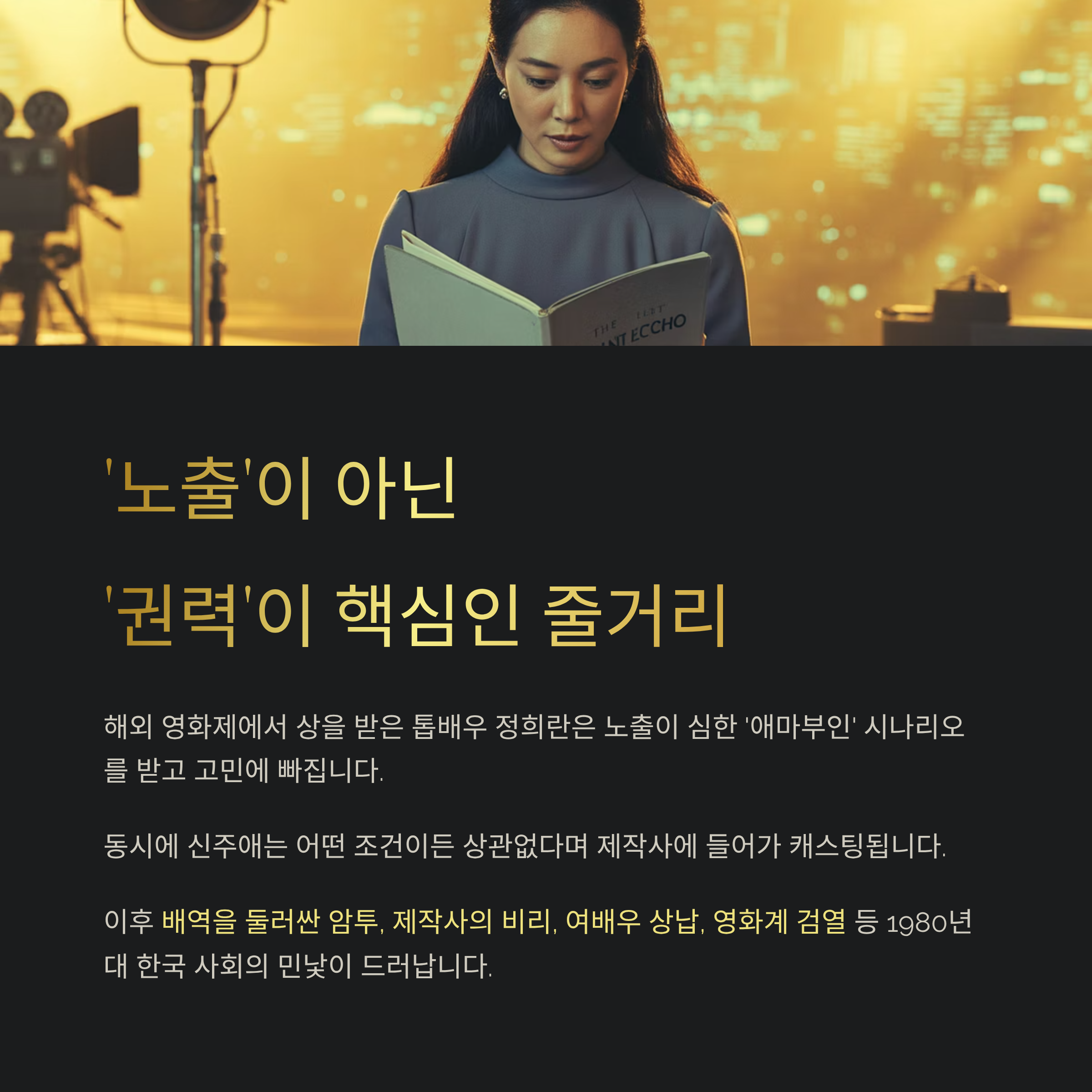 여기서부터 이야기가 본격적으로 꼬이기 시작합니다. 배역을 둘러싼 암투, 제작사의 비리, 여배우 상납, 영화계 검열 시스템 등, 단순히 자극적인 줄거리로 보일 수 있지만 그 안에는 1980년대 한국 사회의 민낯이 녹아 있어요.