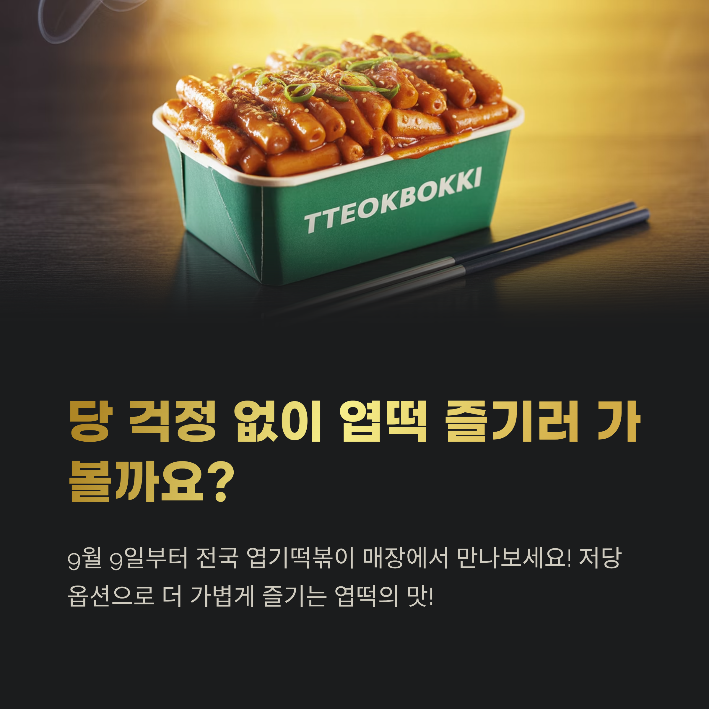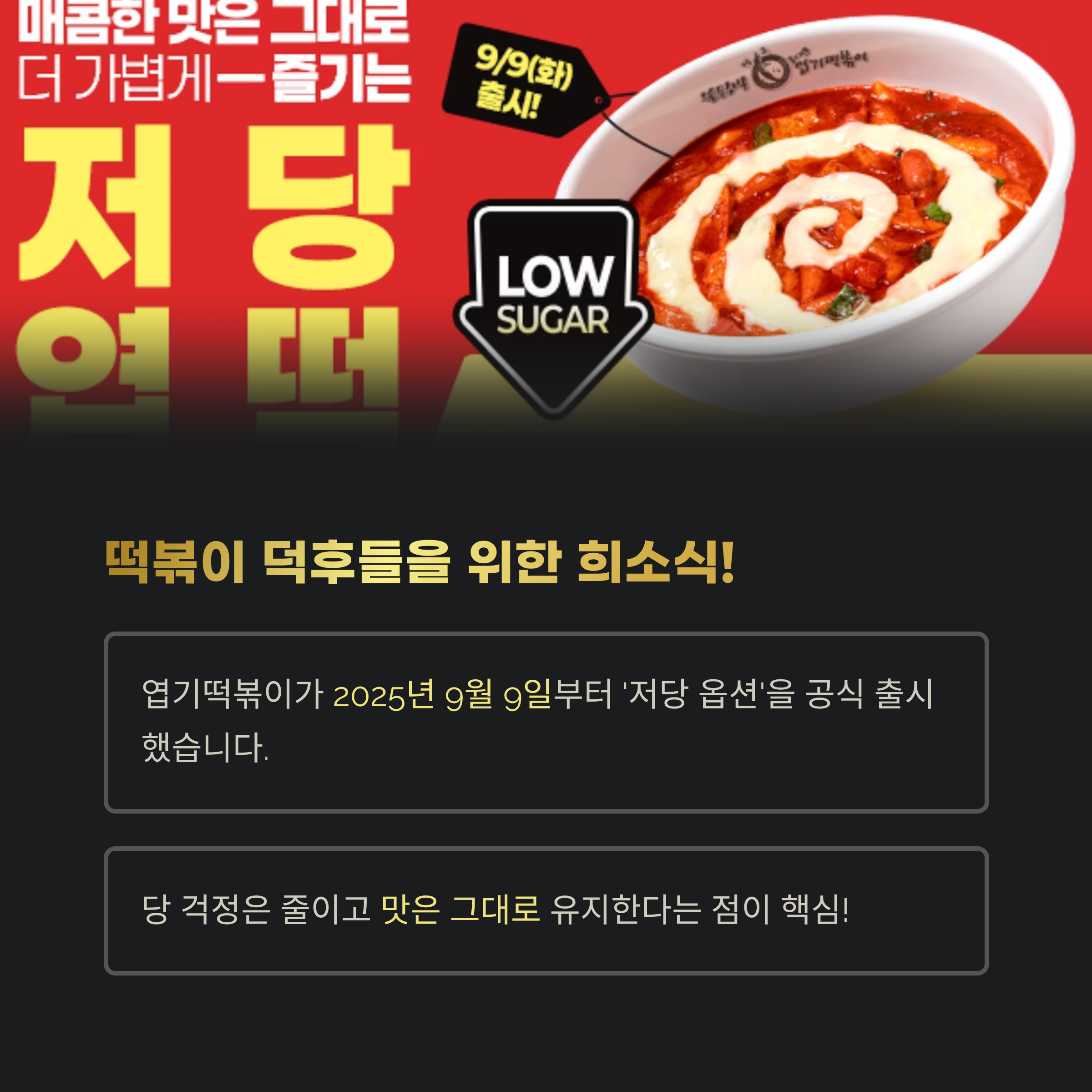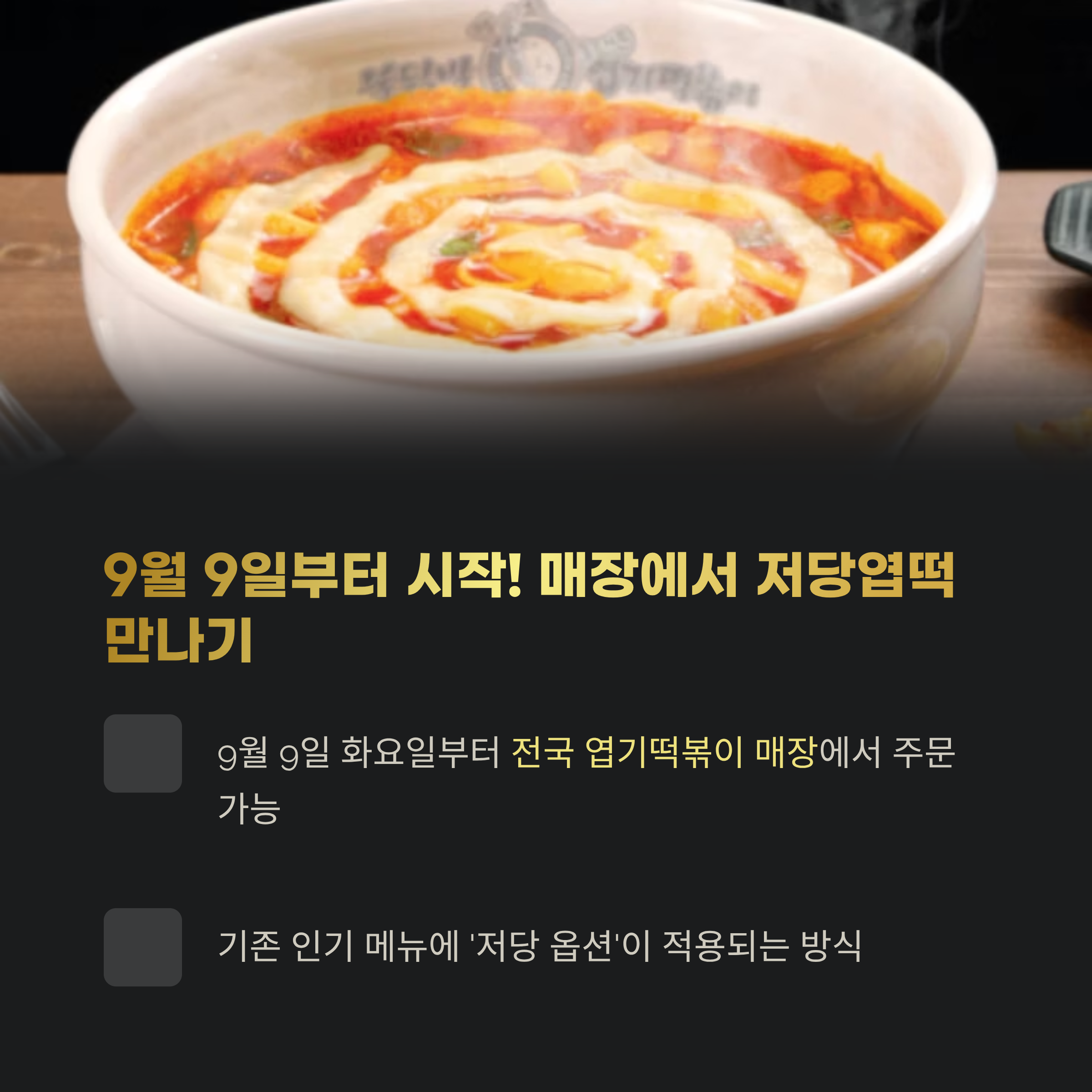 9월 9일 화요일부터 전국 엽기떡볶이 매장에서 저당 옵션 주문이 가능해집니다.