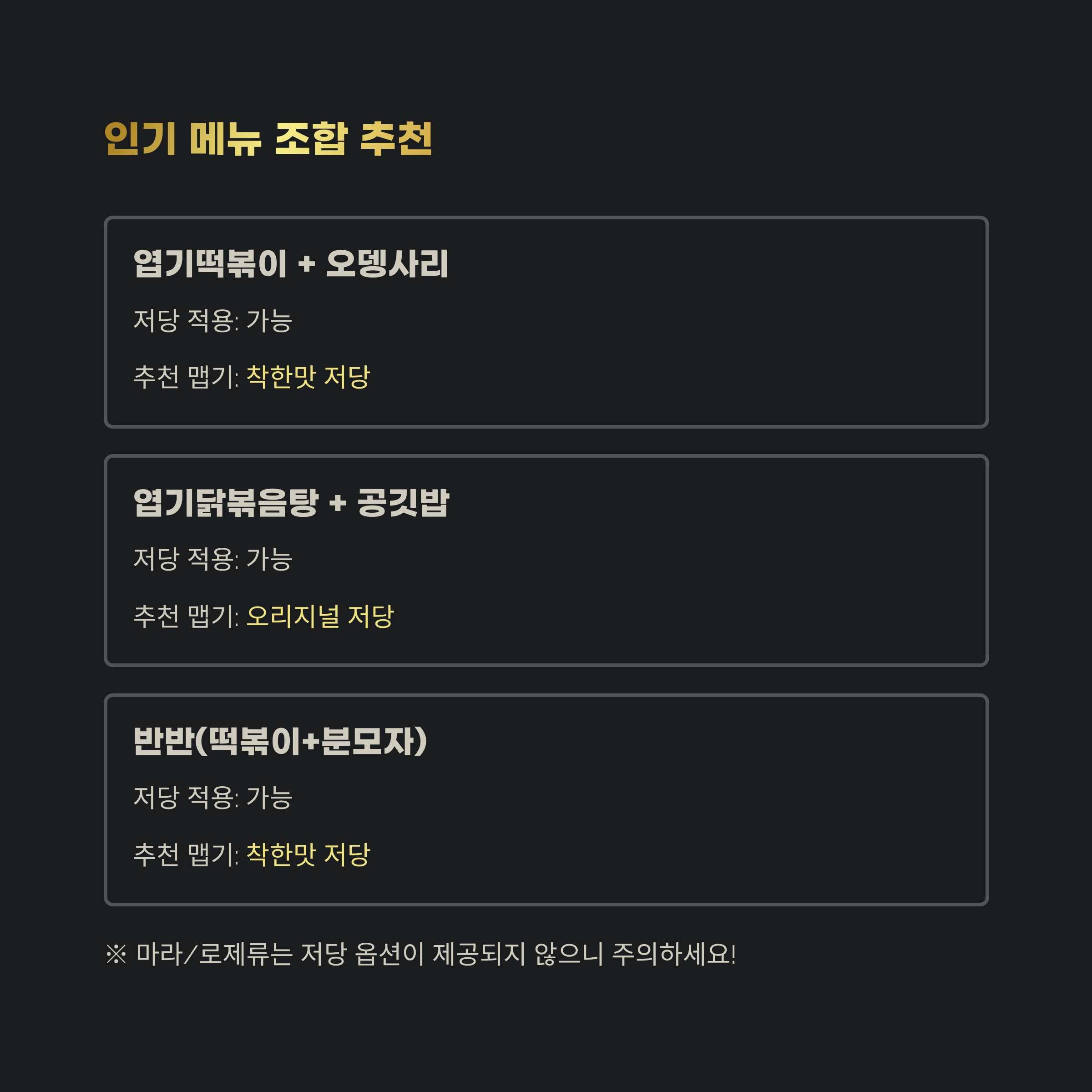저당엽떡을 어떤 조합으로 먹을지 고민된다면, 아래 추천 조합 참고해보세요!
