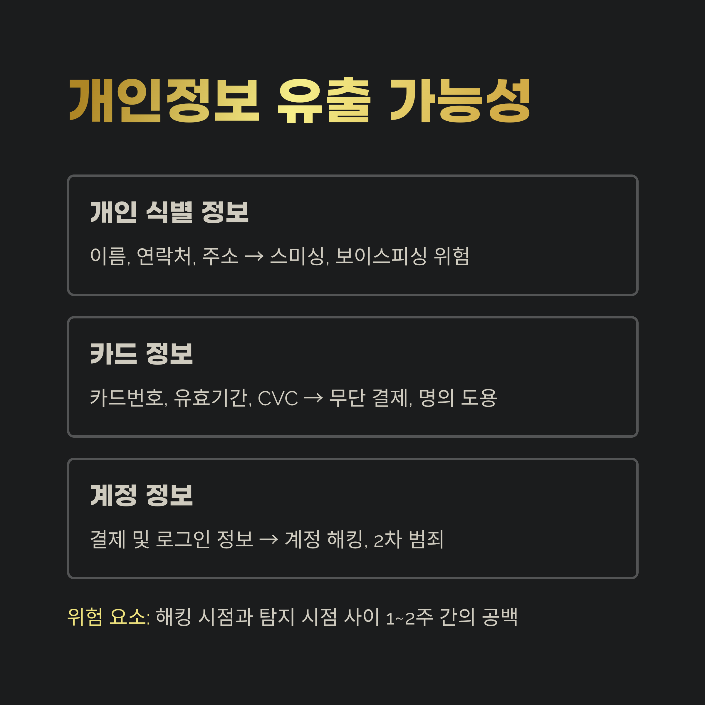 | 결제 및 로그인 정보 | 계정 해킹, 2차 범죄 |