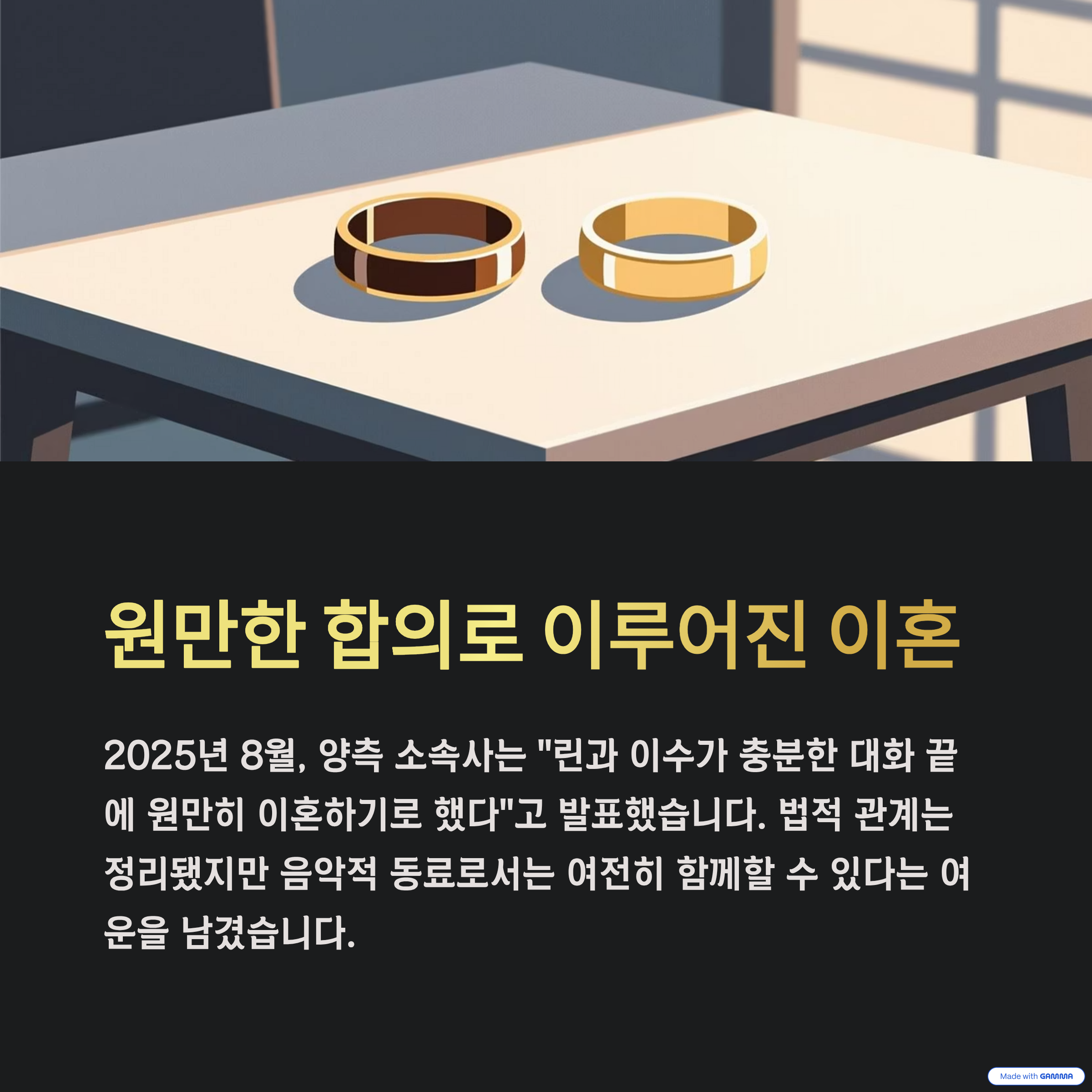 2025년 8월, 양측 소속사는 공식적으로 “린과 이수가 충분한 대화 끝에 원만히 이혼하기로 했다”고 발표했습니다.