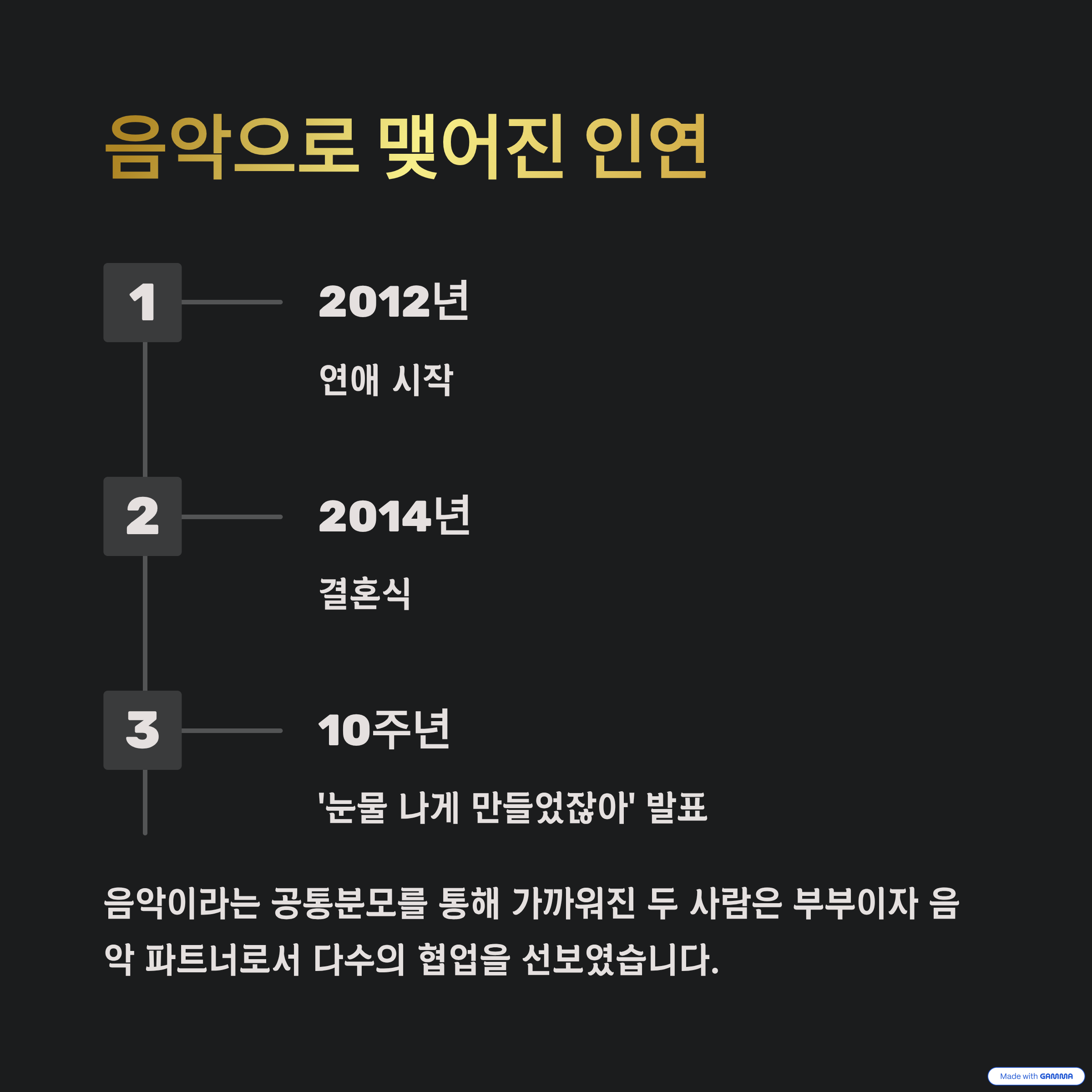 특히 결혼 10주년 즈음 발표된 듀엣곡 '눈물 나게 만들었잖아'는 감성적인 메시지를 담으며 많은 사랑을 받았죠.
