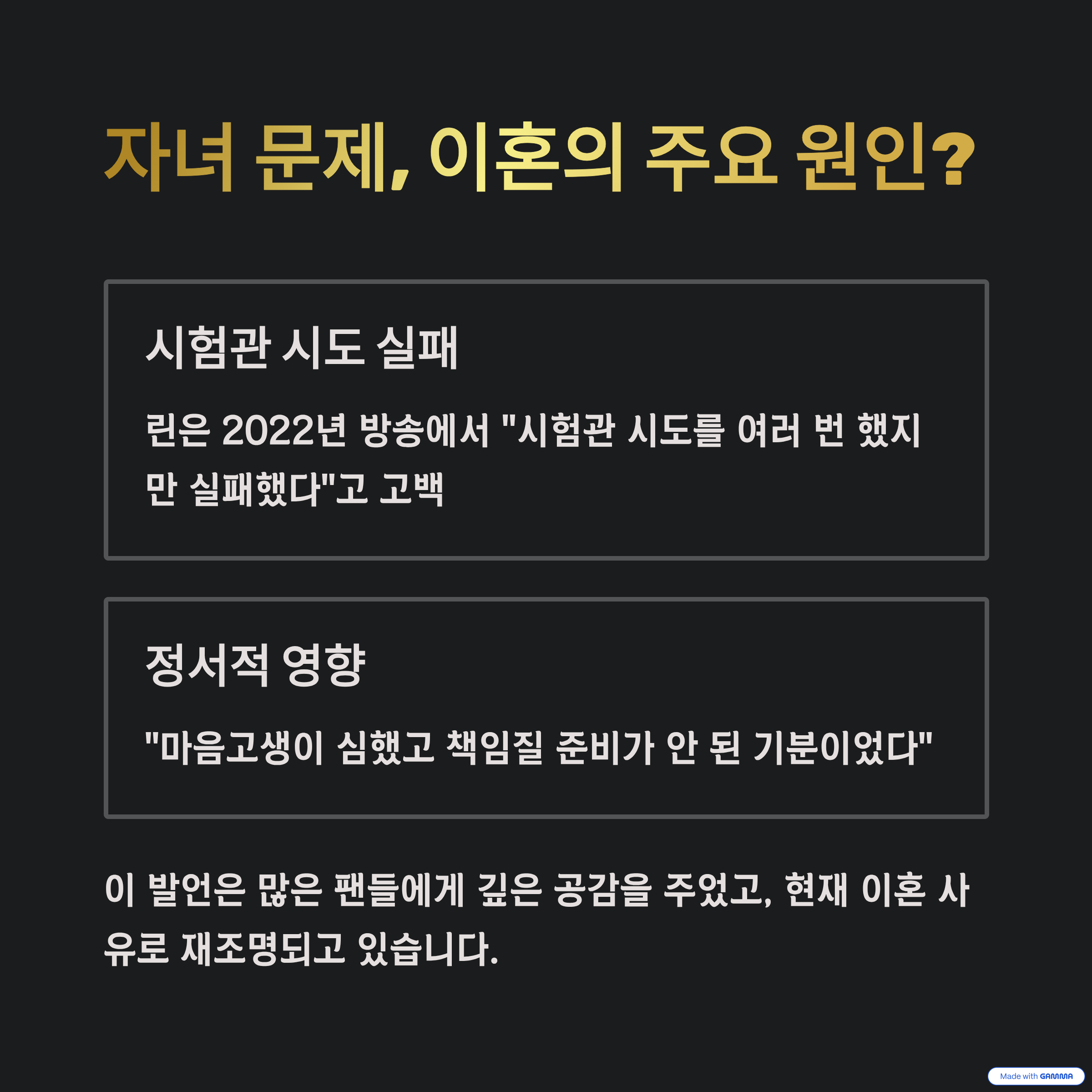 실제로 린은 2022년 방송에서 “시험관 시도를 여러 번 했지만 실패했다”며