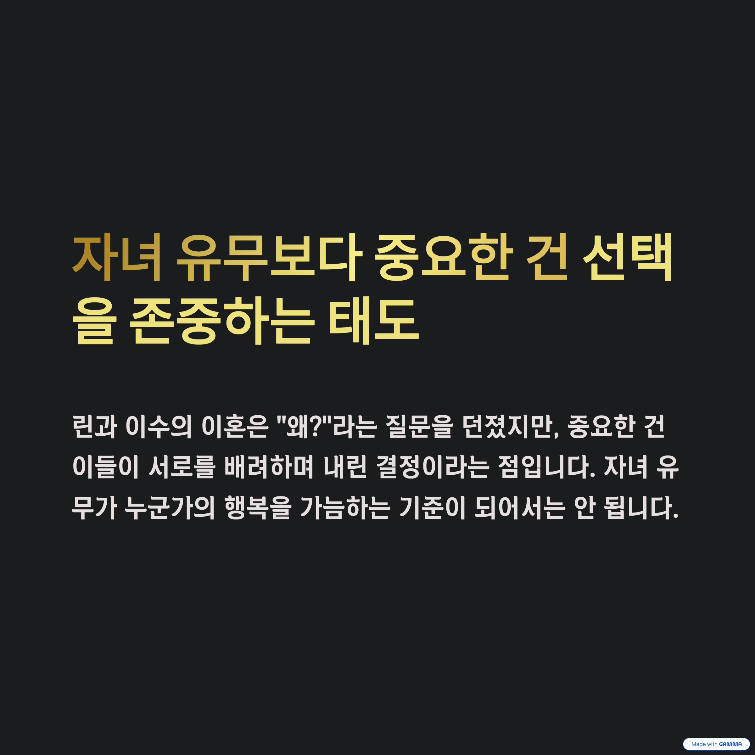 중요한 건 이들이 서로를 배려하며 내린 결정이라는 점이고, 무엇보다 자녀 유무 같은 민감한 사안이 누군가의 행복을 가늠하는 기준이 되어서는 안 된다는 사실입니다.