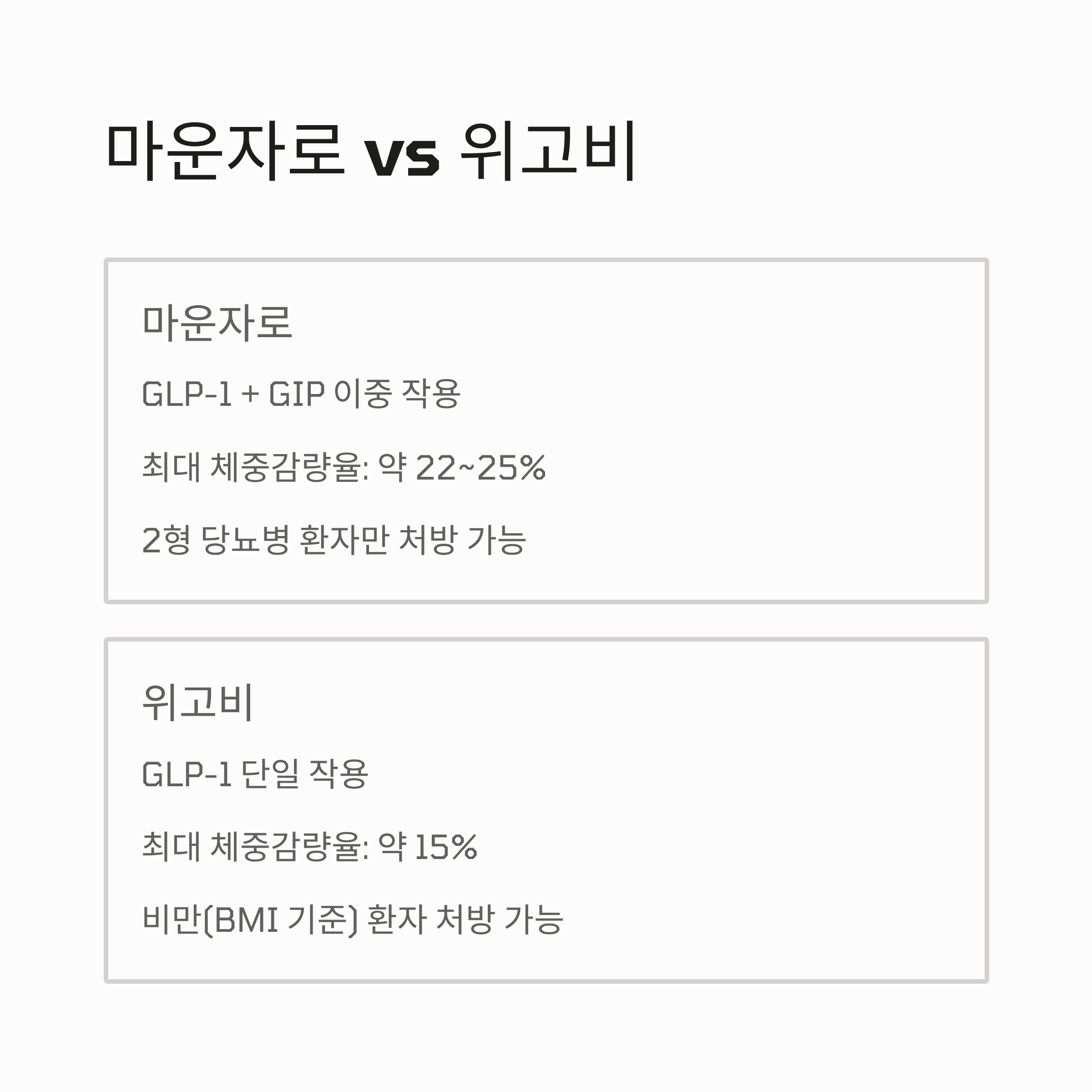 | 작용 방식 | GLP-1 + GIP 이중 작용 | GLP-1 단일 작용 |