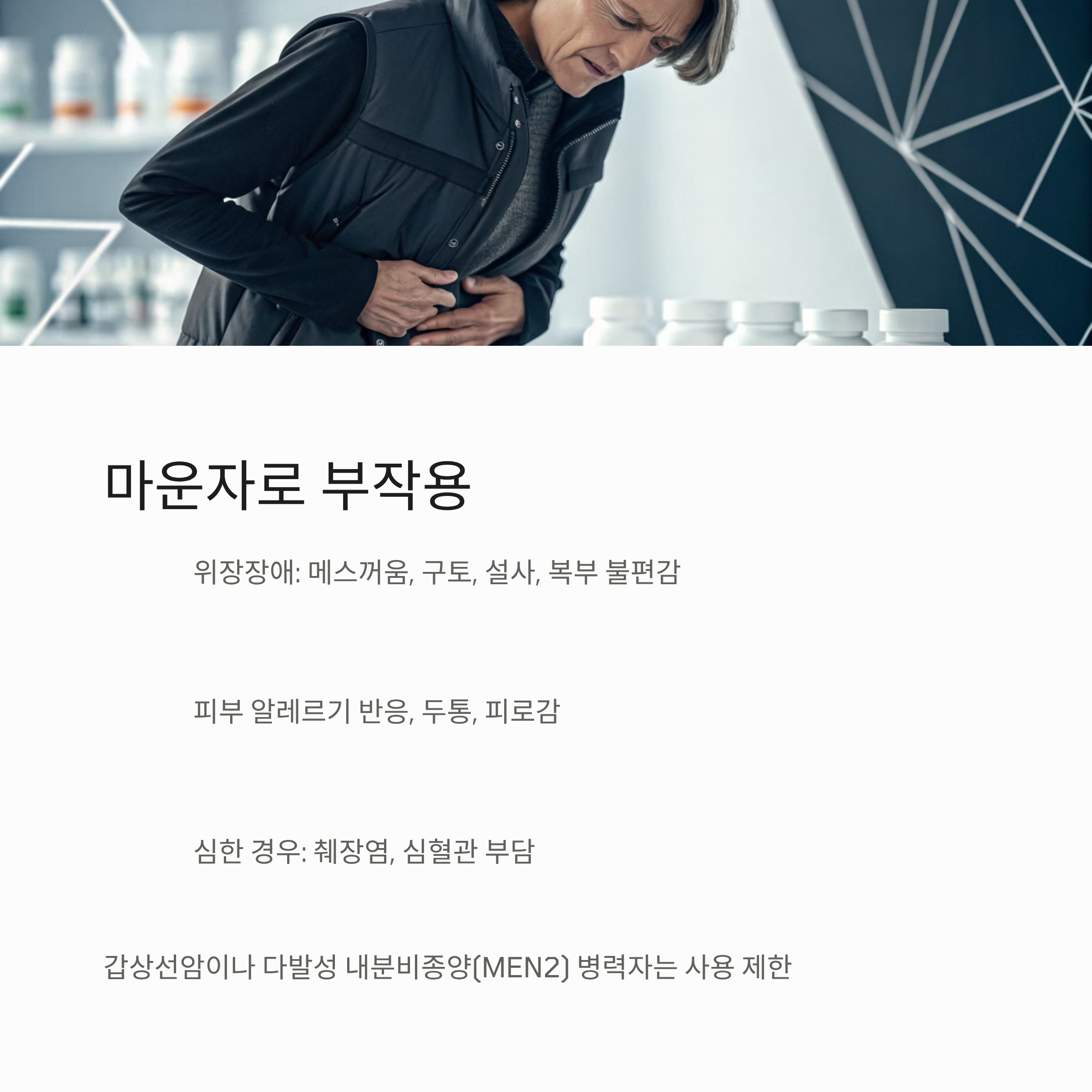 또한 갑상선암이나 다발성 내분비종양(MEN2) 병력이 있는 경우 사용이 제한됩니다.