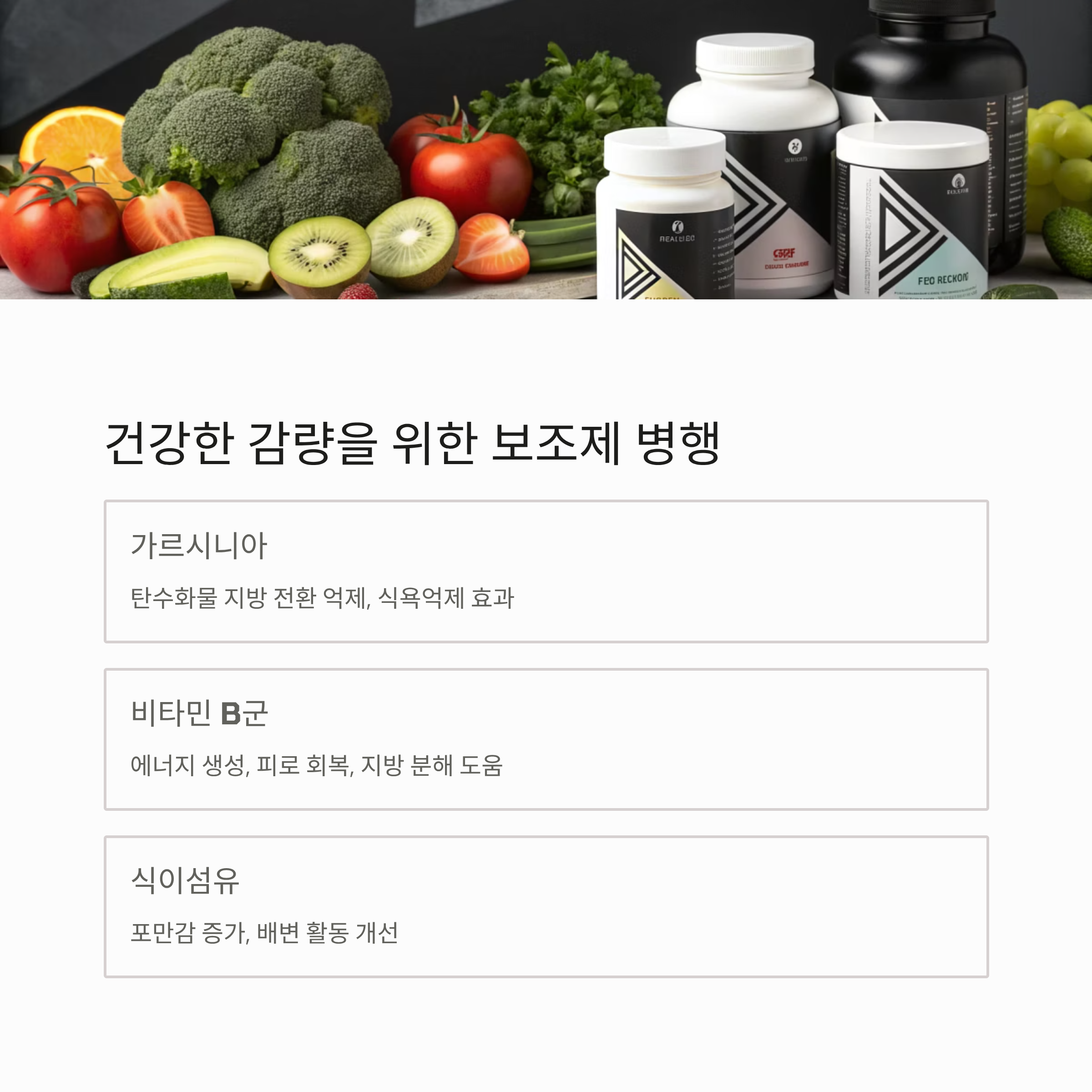 - 기존 보조제(가르시니아+비타민 포함)와 병행하면서 요요 방지 및 영양 밸런스 유지