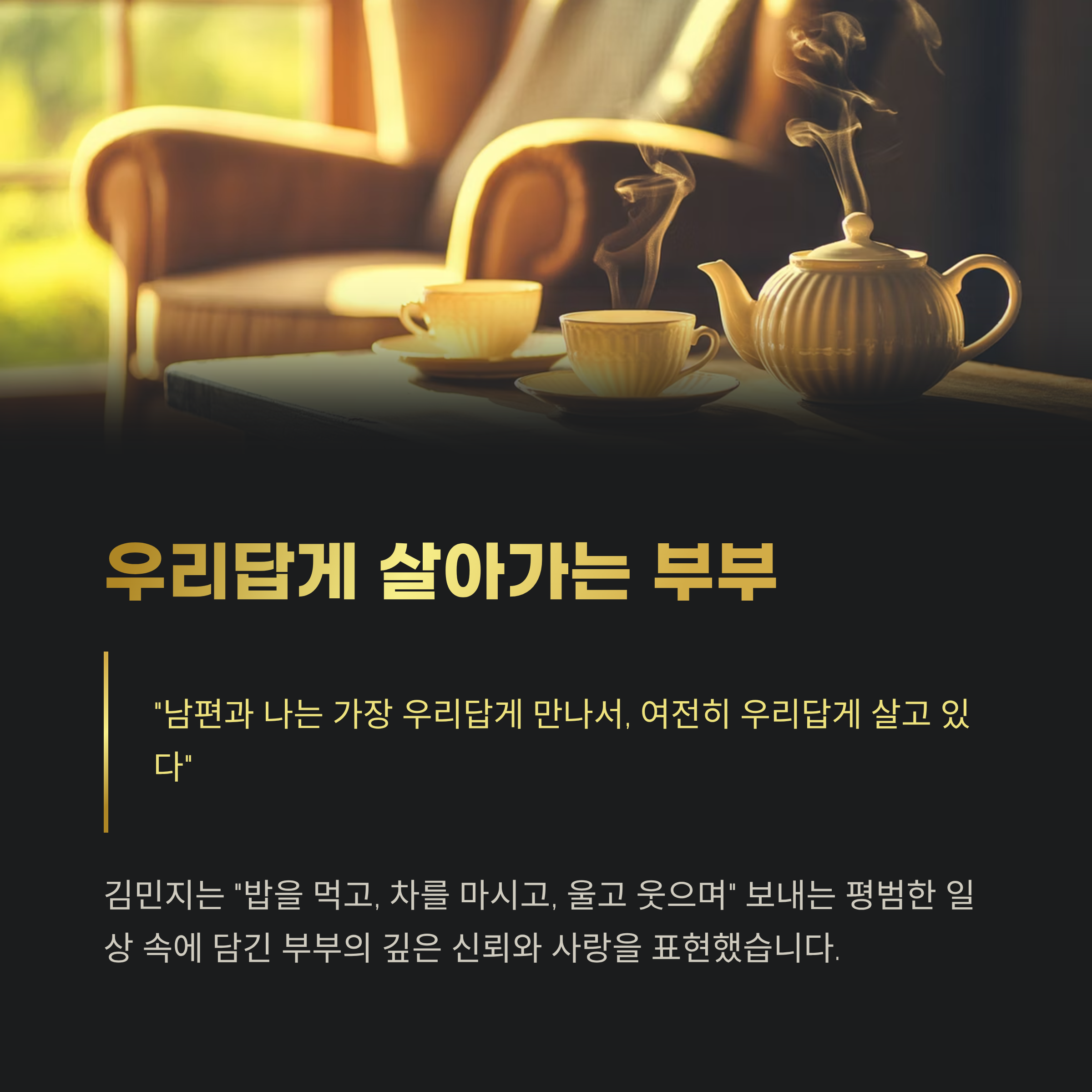 하루하루를 “밥을 먹고, 차를 마시고, 울고 웃으며” 보내는 평범한 일상. 하지만 그 안에는 이들 부부의 깊은 신뢰와 사랑이 담겨 있었습니다.
