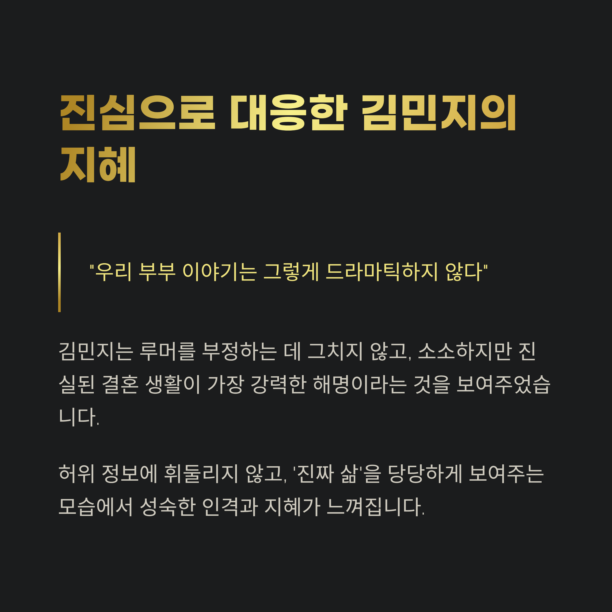“우리 부부 이야기는 그렇게 드라마틱하지 않다”는 말처럼, 소소하지만 진실된 결혼 생활이 가장 강력한 해명이라는 것을 보여준 것이죠.
