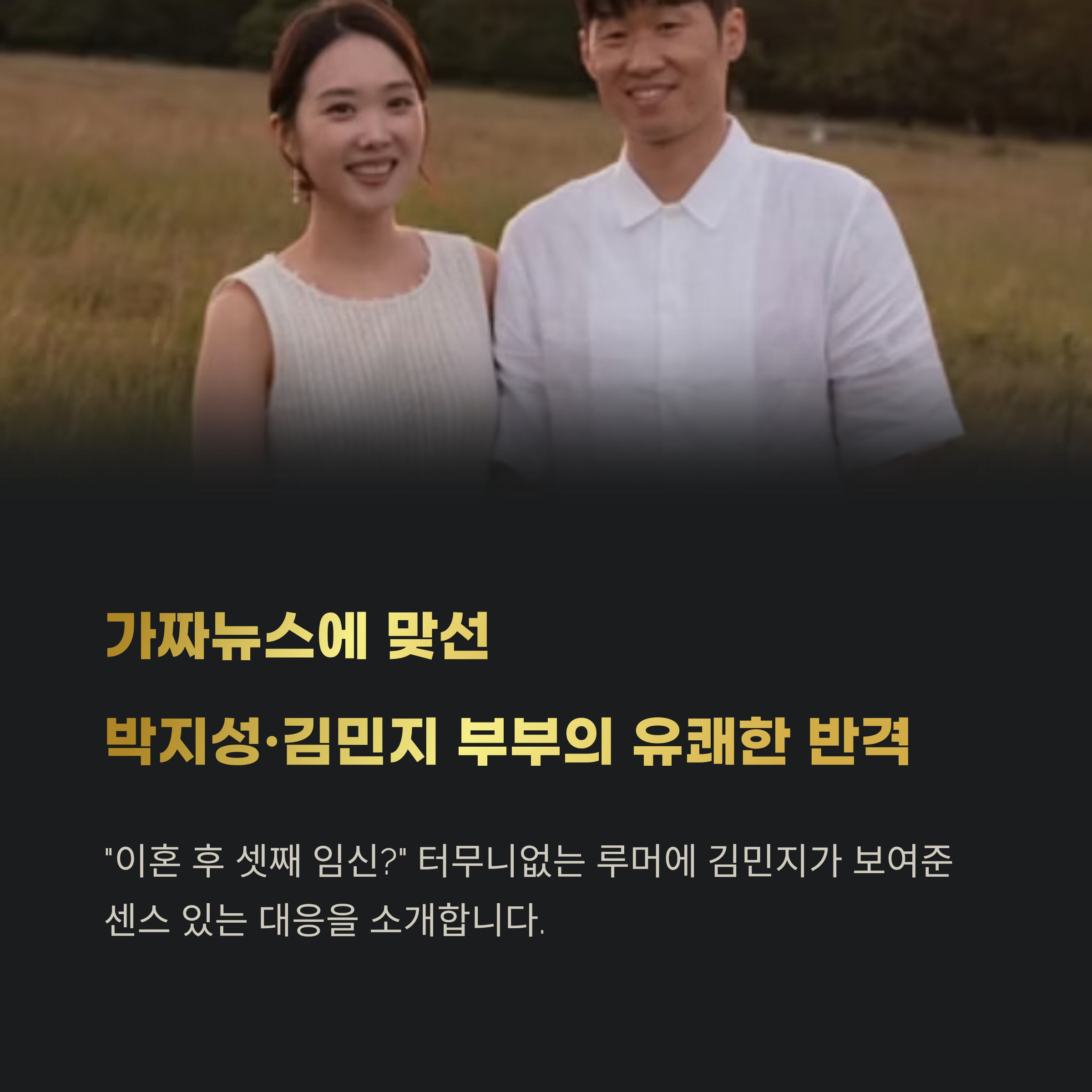 최근 박지성·김민지 부부를 둘러싼 자극적인 가짜뉴스가 온라인을 달구며 논란이 되었습니다. "이혼 후 셋째 임신"이라는 터무니없는 루머가 퍼지자, 김민지는 SNS를 통해 직접 입장을 밝혔고, 유쾌하고 당당한 해명으로 많은 이들의 공감을 얻었는데요. 이번 글에서는 이 부부를 향한 루머의 전말과 김민지의 센스 있는 대응, 그리고 이들이 보여준 단단한 결혼 생활에 대해 짚어보겠습니다.