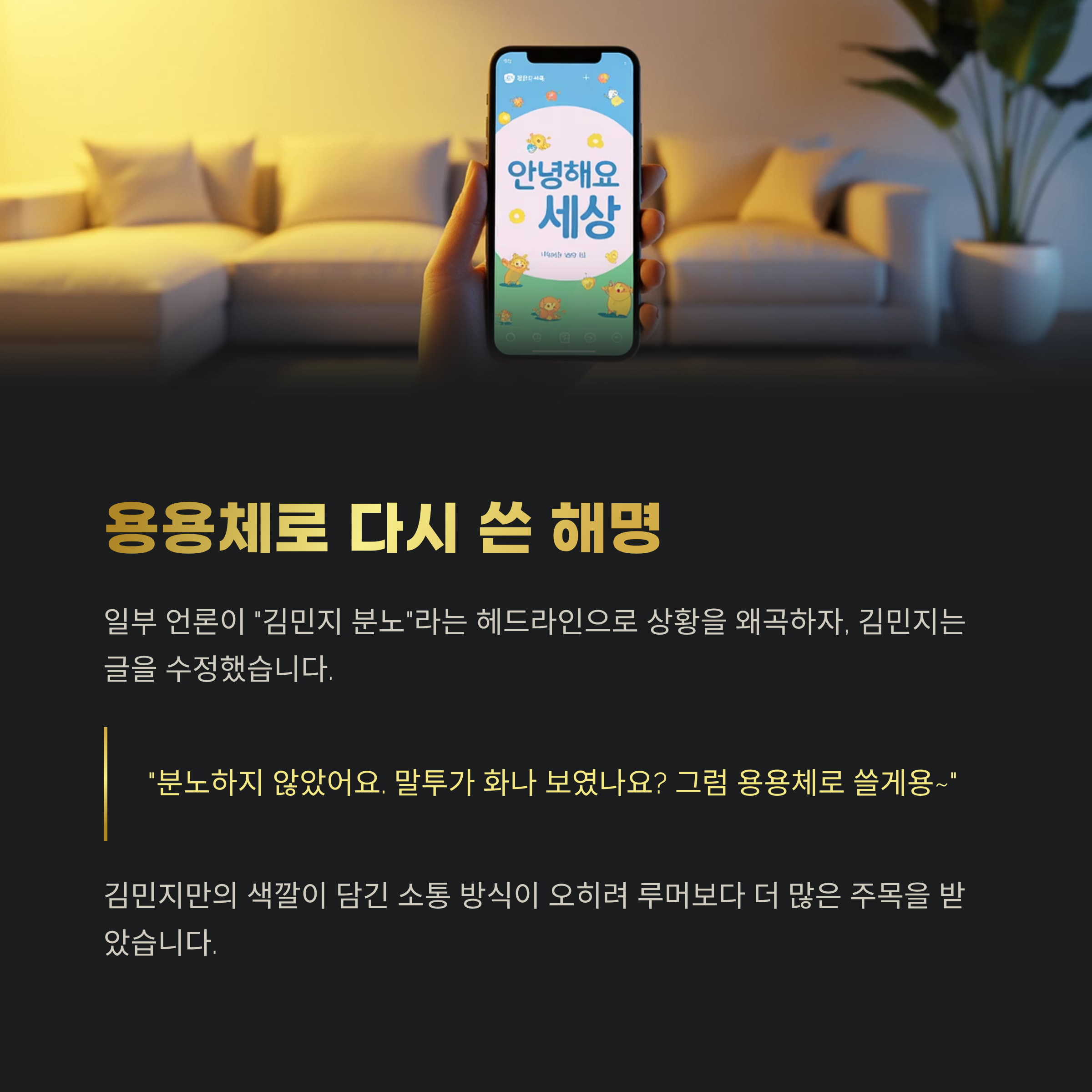 단순한 해명이 아니라, 김민지만의 색깔이 담긴 소통 방식이 오히려 루머보다 더 많은 주목을 받게 만들었습니다.