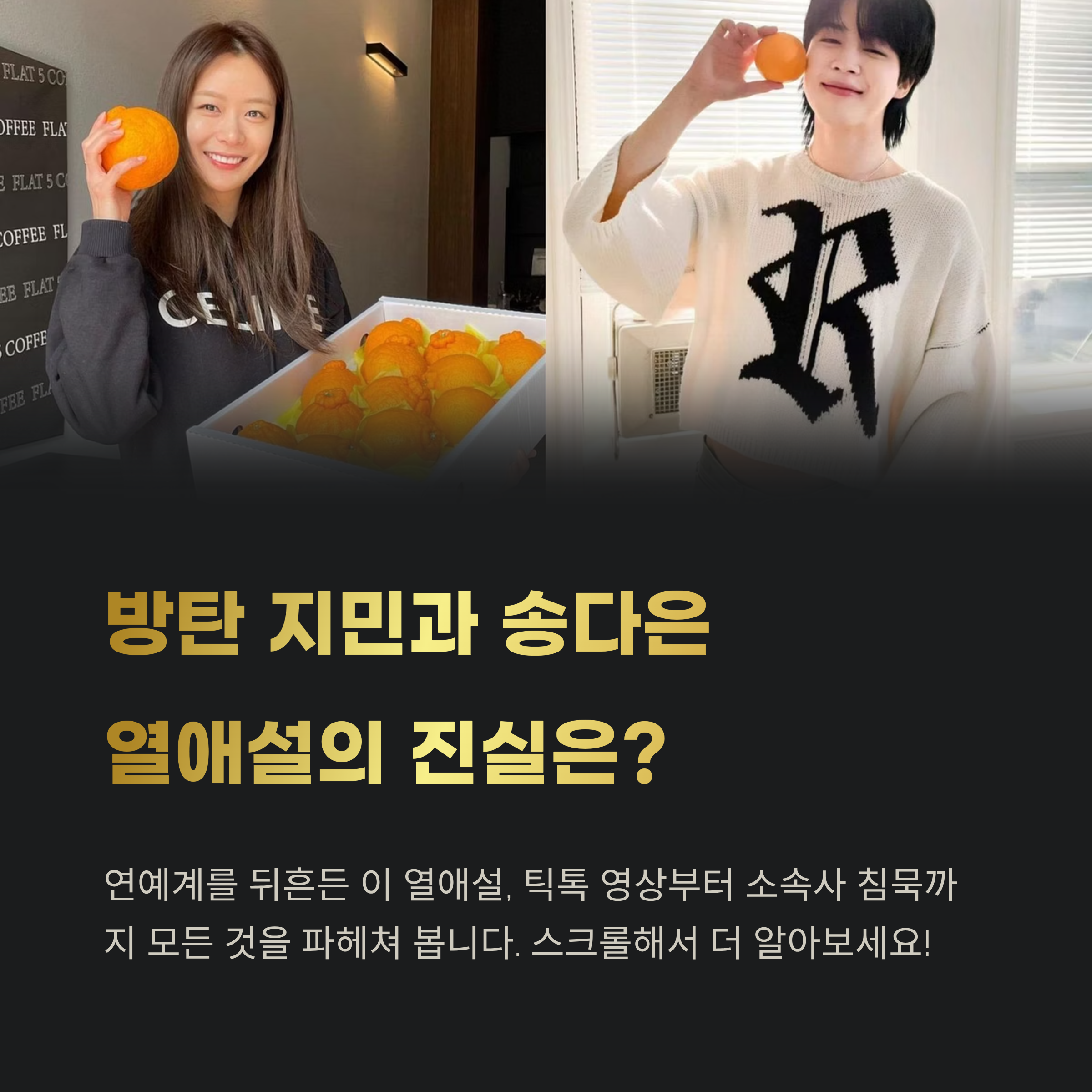 송다은이 자신의 틱톡 계정에 올린 짧은 영상 하나가 시작이었습니다. 영상 속 그녀는 아파트 복도에서 누군가를 기다리다, 엘리베이터에서 등장한 남성과 반갑게 인사했는데요. 이 남성이 지민으로 보인다는 의견이 확산되면서 열애설은 빠르게 번졌습니다. 심지어 배경이 지민의 거주지와 비슷하다는 주장까지 나오며 동거설까지 등장한 상황입니다.