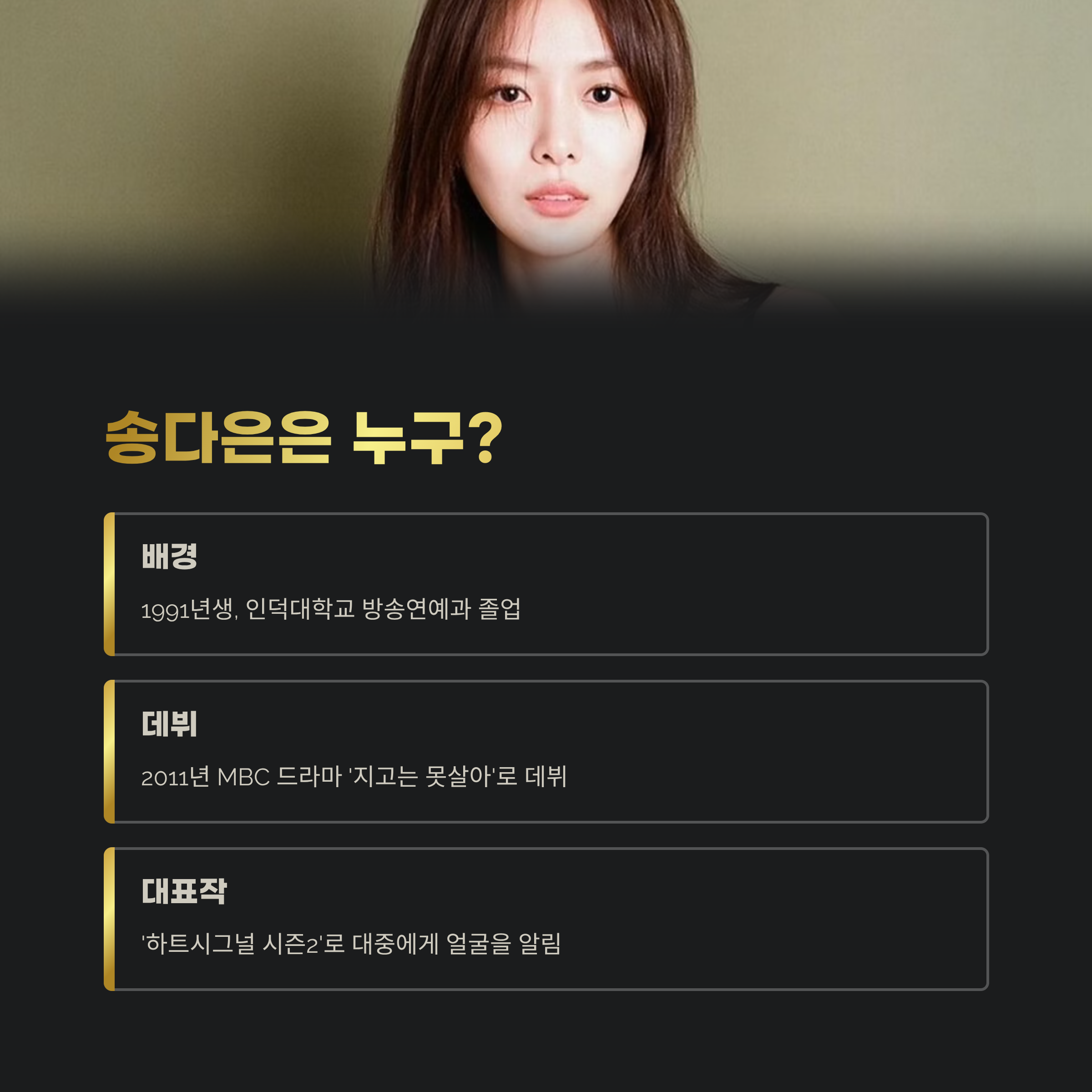 송다은은 1991년생으로, 인덕대학교 방송연예과를 졸업한 배우입니다. 2011년 MBC 드라마 '지고는 못살아'를 통해 데뷔한 뒤, 드라마와 예능, 광고 등 다양한 분야에서 활동해왔습니다. 대중에게는 '하트시그널 시즌2'를 통해 본격적으로 얼굴을 알렸고, 감성적이고 섬세한 연기로 팬층을 쌓아온 인물이죠.
