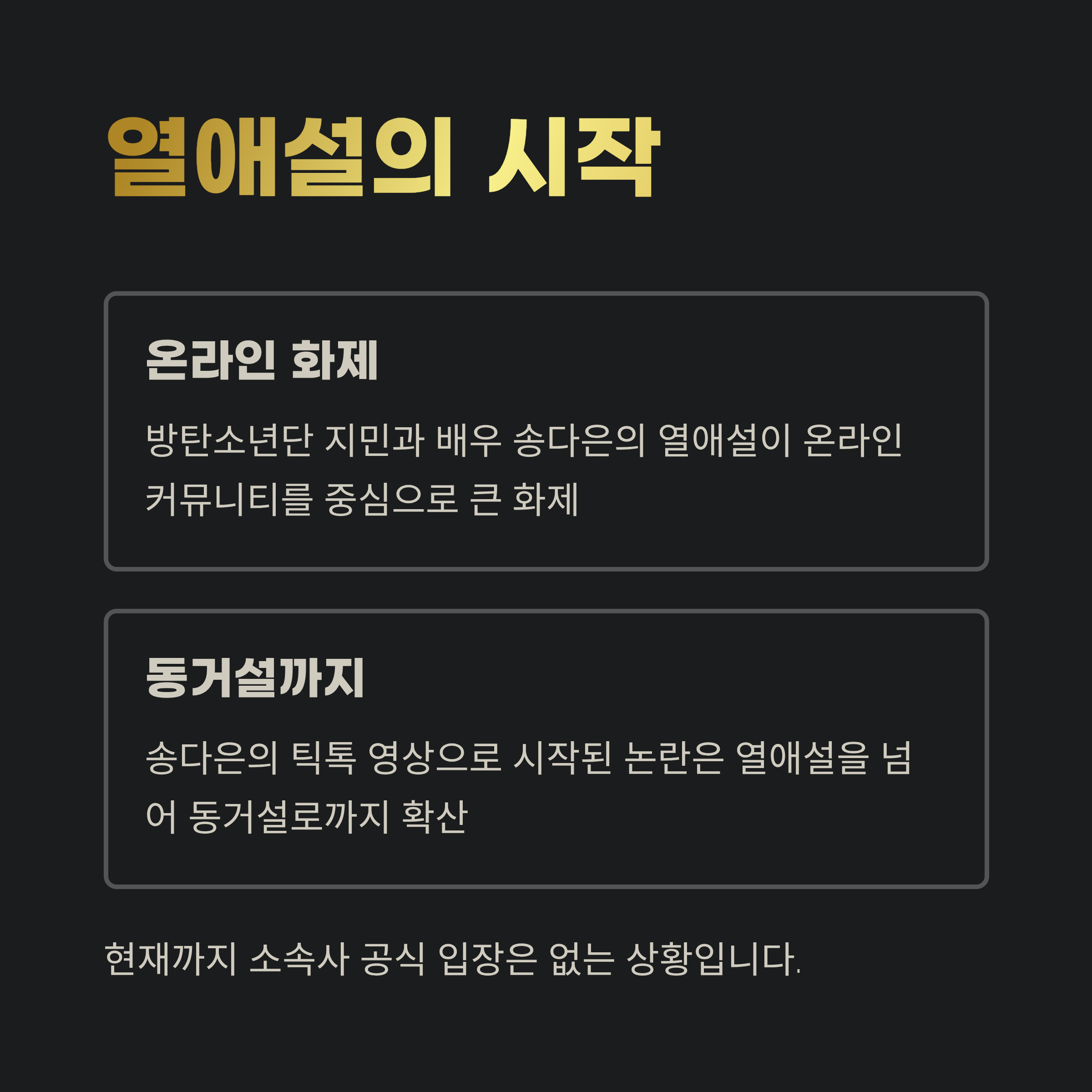 틱톡 영상은 곧 삭제됐지만, 이미 수많은 유저들에 의해 캡처 및 공유된 상태입니다. 영상 속 지민으로 추정되는 인물이 말한 "내가 일부러 말 안 하고 온 건데"라는 대사는 동거 의혹에 더욱 불을 지폈죠. 하지만 현재까지 양측 소속사 모두 공식 입장을 밝히지 않아, 사실 여부는 여전히 미궁 속에 있습니다.