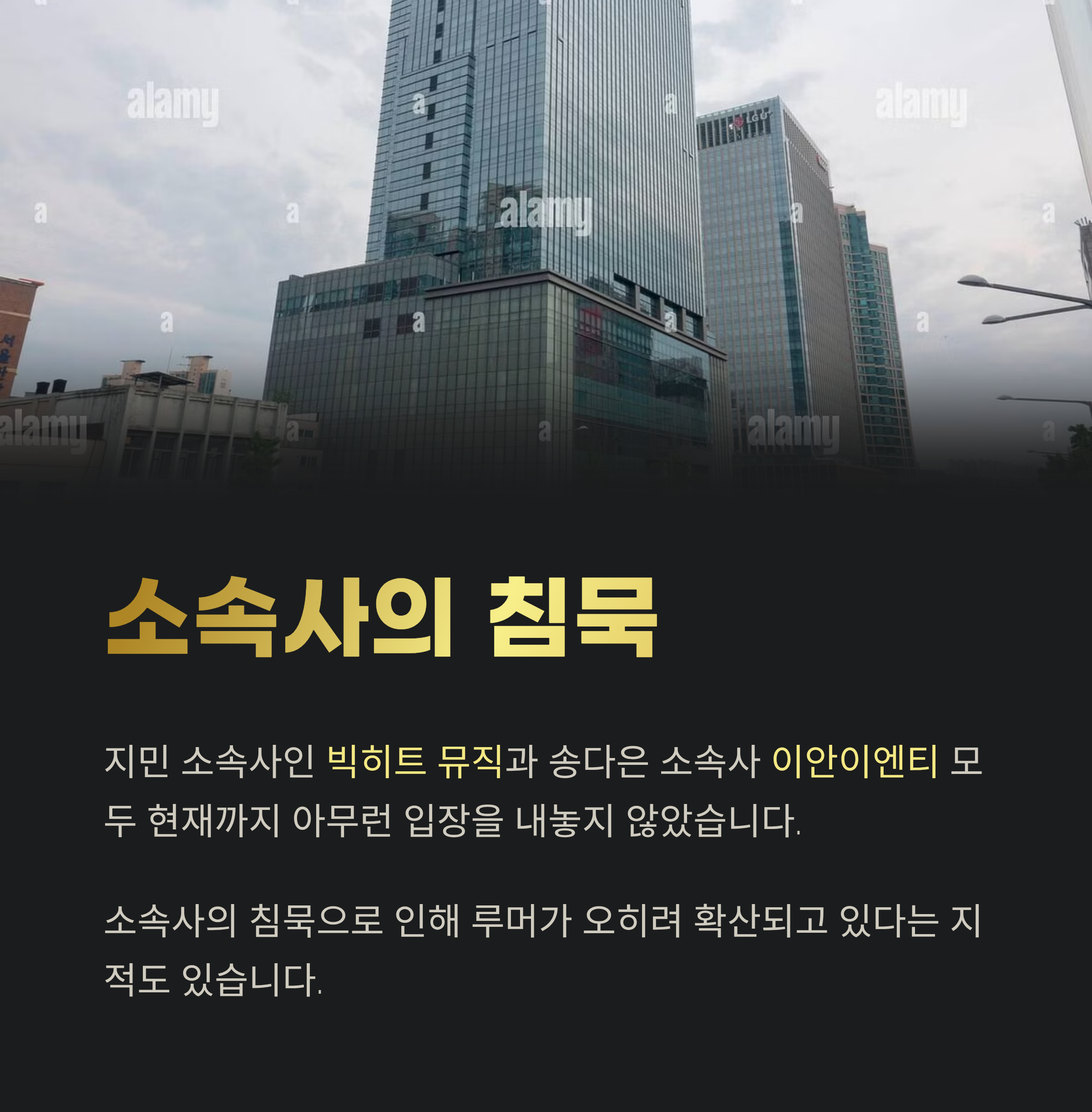 지민 소속사인 빅히트 뮤직과 송다은 소속사 이안이엔티 모두 현재까지는 아무런 입장을 내놓지 않았습니다. 소속사 측에서 입장을 내지 않음으로 인해 루머가 오히려 확산되고 있다는 지적도 있습니다. 어떤 식으로든 공식적인 언급이 필요한 시점이라는 의견도 많아지고 있습니다.