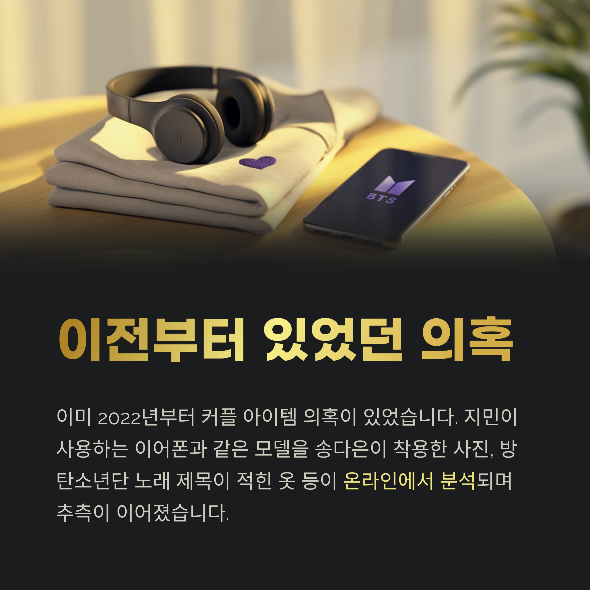 지민과 송다은의 열애설은 이번이 처음이 아닙니다. 이미 2022년부터 커플 아이템 의혹, SNS 게시물 내용 등으로 의심을 받은 바 있습니다. 예를 들면 지민이 자주 사용하는 이어폰과 같은 모델을 송다은이 착용한 사진, 방탄소년단 노래 제목이 적힌 옷, 비슷한 장소 배경의 사진 등이 온라인에서 분석되며 팬들 사이에서 여러 추측이 오갔습니다.
