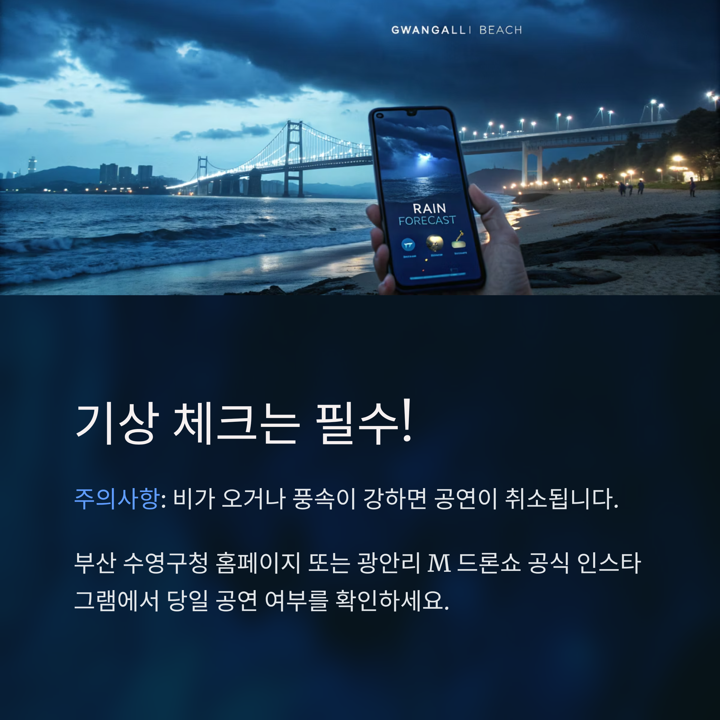 광안리 드론쇼는 실외에서 진행되므로 비가 오거나 풍속이 강하면 공연이 취소됩니다.