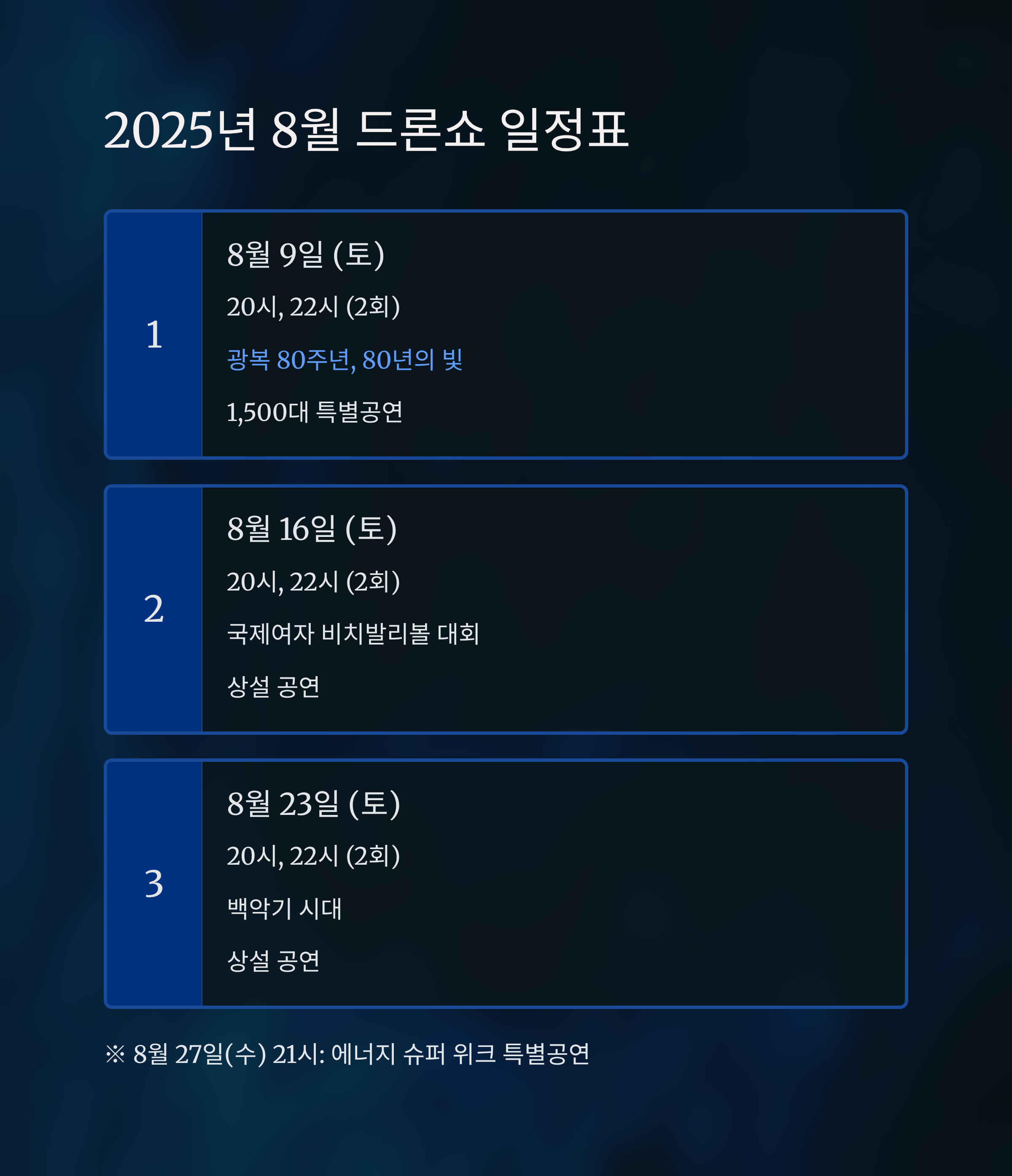 | 8월 9일 (토) | 20시, 22시 (2회) | 광복 80주년, 80년의 빛 | 1,500대 특별공연 |