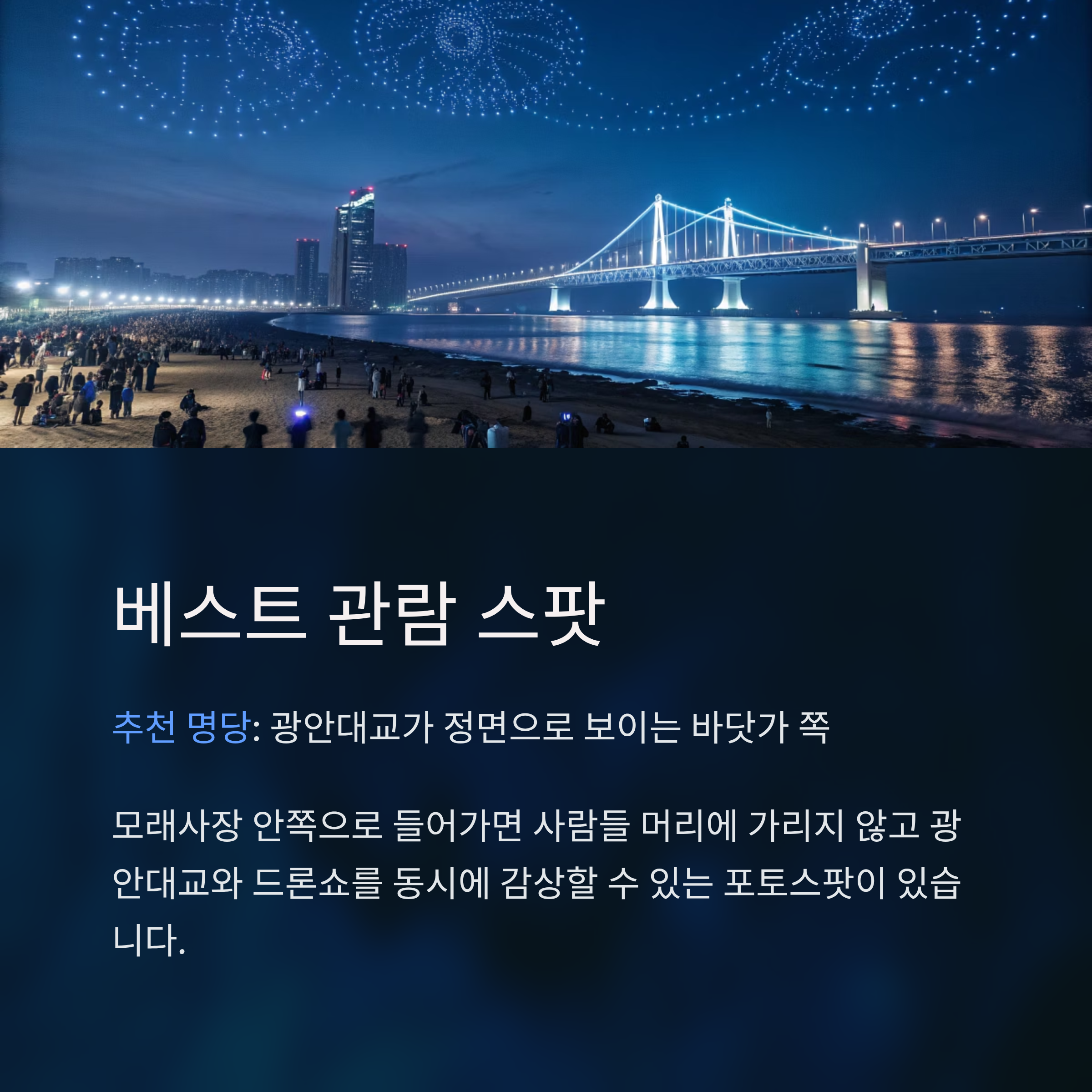 드론쇼는 광안리 해변 일대에서 진행되며, 어디서든 볼 수 있지만