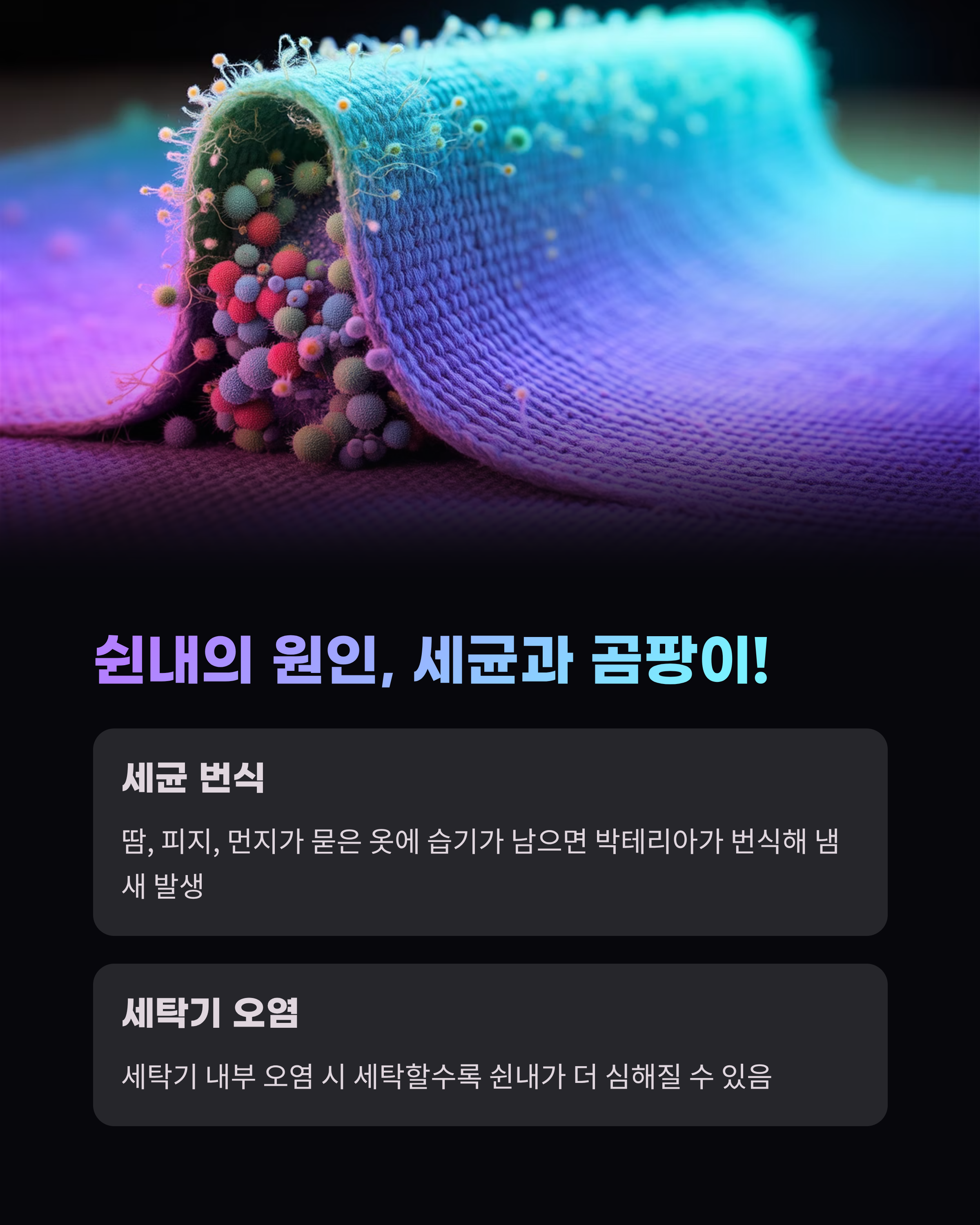빨래에서 나는 쉰내는 대부분 ‘세균’ 때문입니다. 땀, 피지, 먼지 등이 묻은 옷이나 수건에 습기가 남아있으면 박테리아가 번식하면서 냄새가 나요.