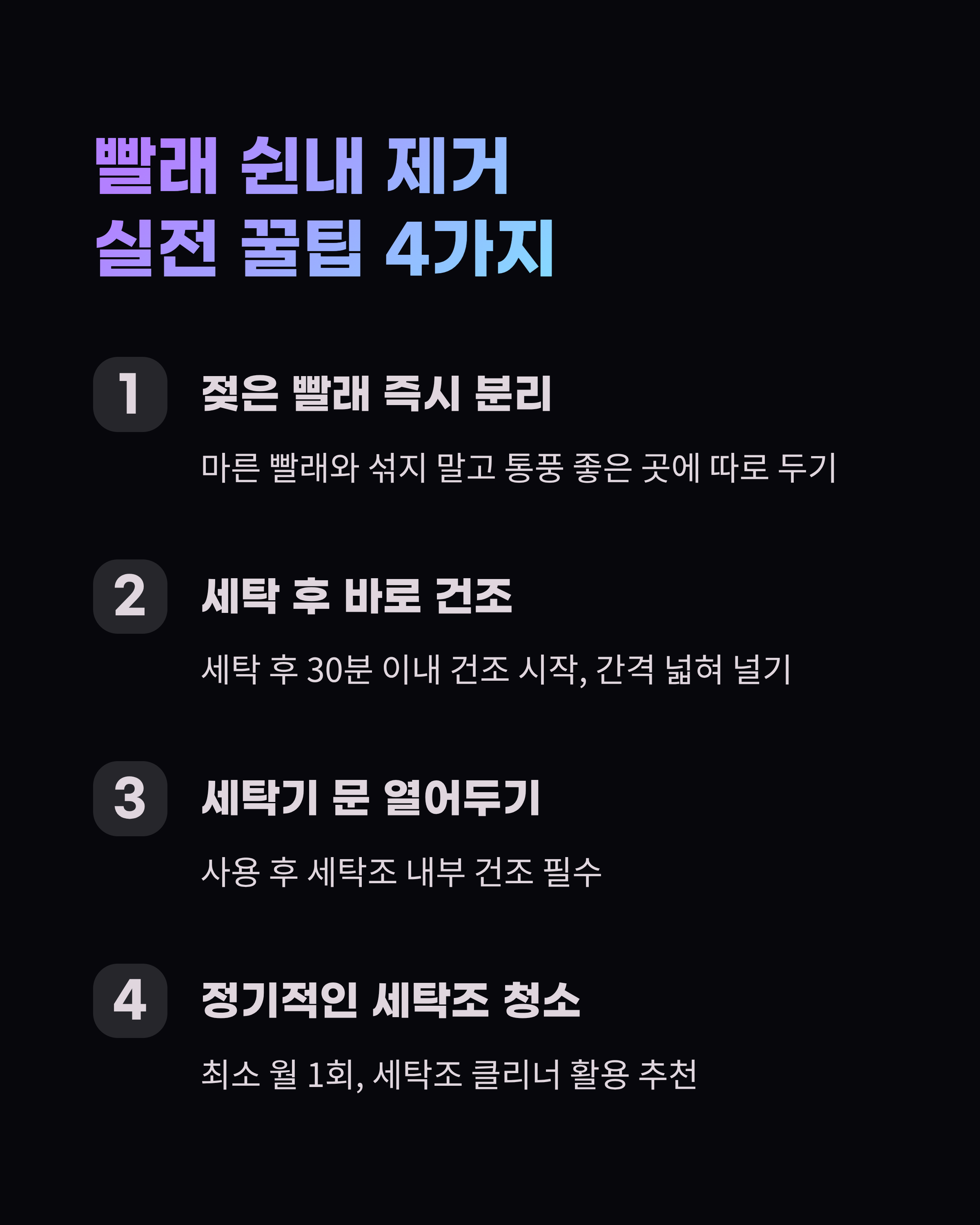 | 젖은 빨래 즉시 분리 | 마른 빨래와 섞지 말고 통풍 좋은 곳에 따로 두기 |