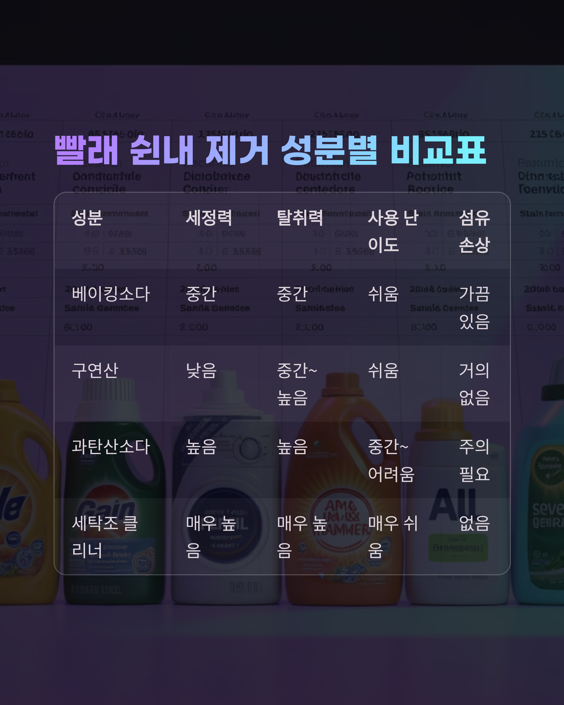 | 성분 | 세정력 | 탈취력 | 사용 난이도 | 섬유 손상 가능성 |
