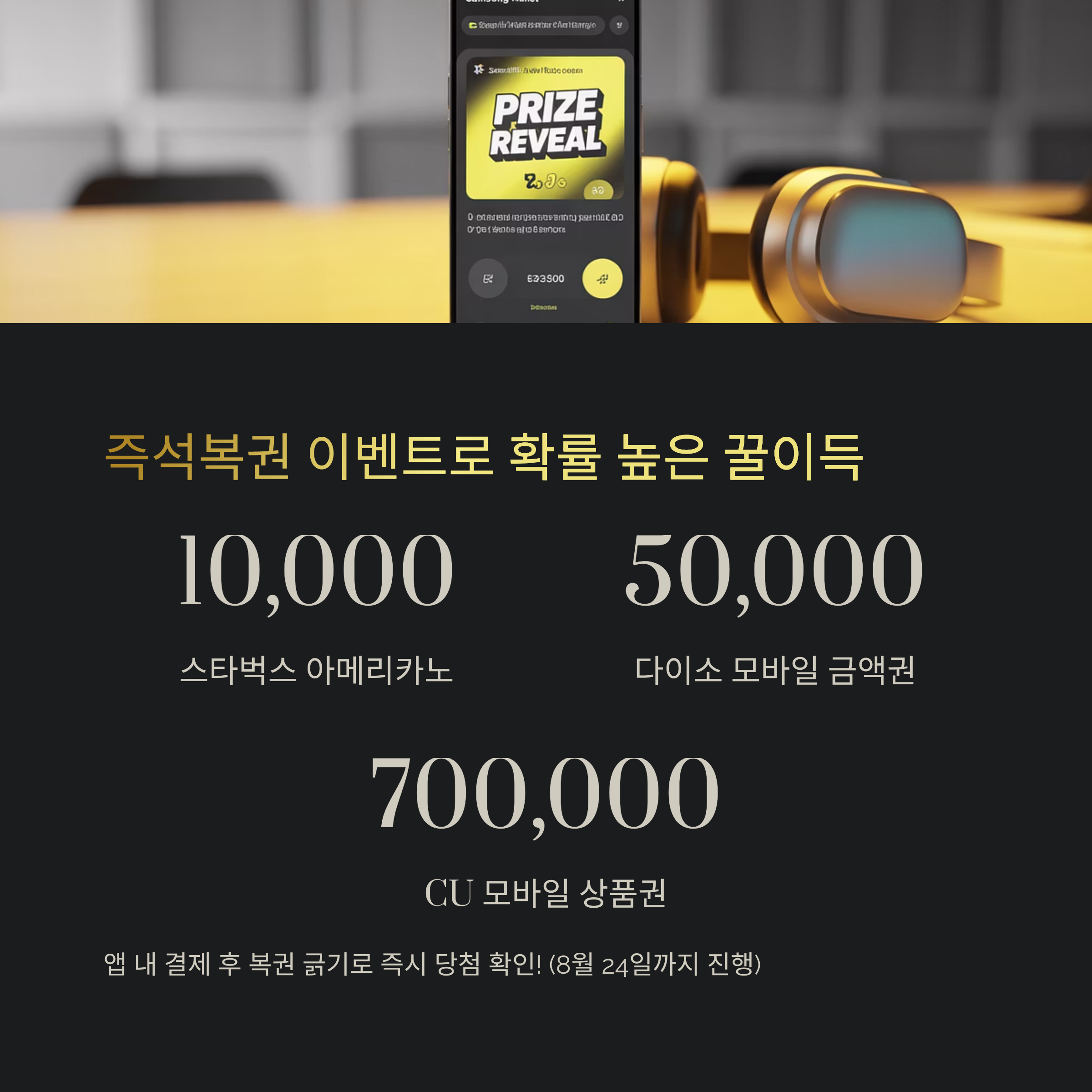 삼성월렛 앱 내 ‘새소식’ 메뉴에서 참여 가능한 즉석복권 이벤트는 8월 24일까지 진행됐습니다.