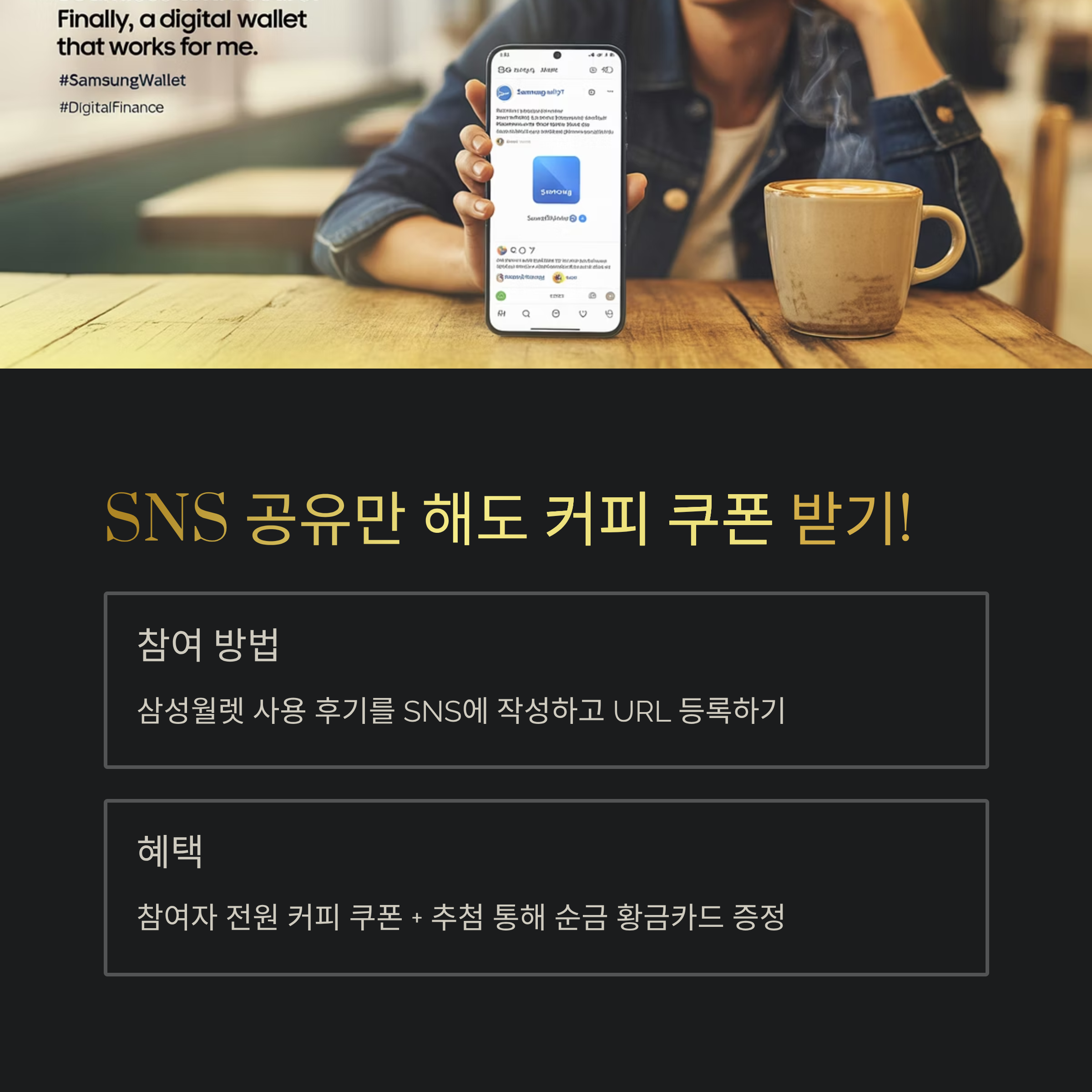 | SNS 공유 이벤트 | 사용기 업로드 후 링크 제출 | 커피 쿠폰 전원 증정, 황금카드 추첨 |