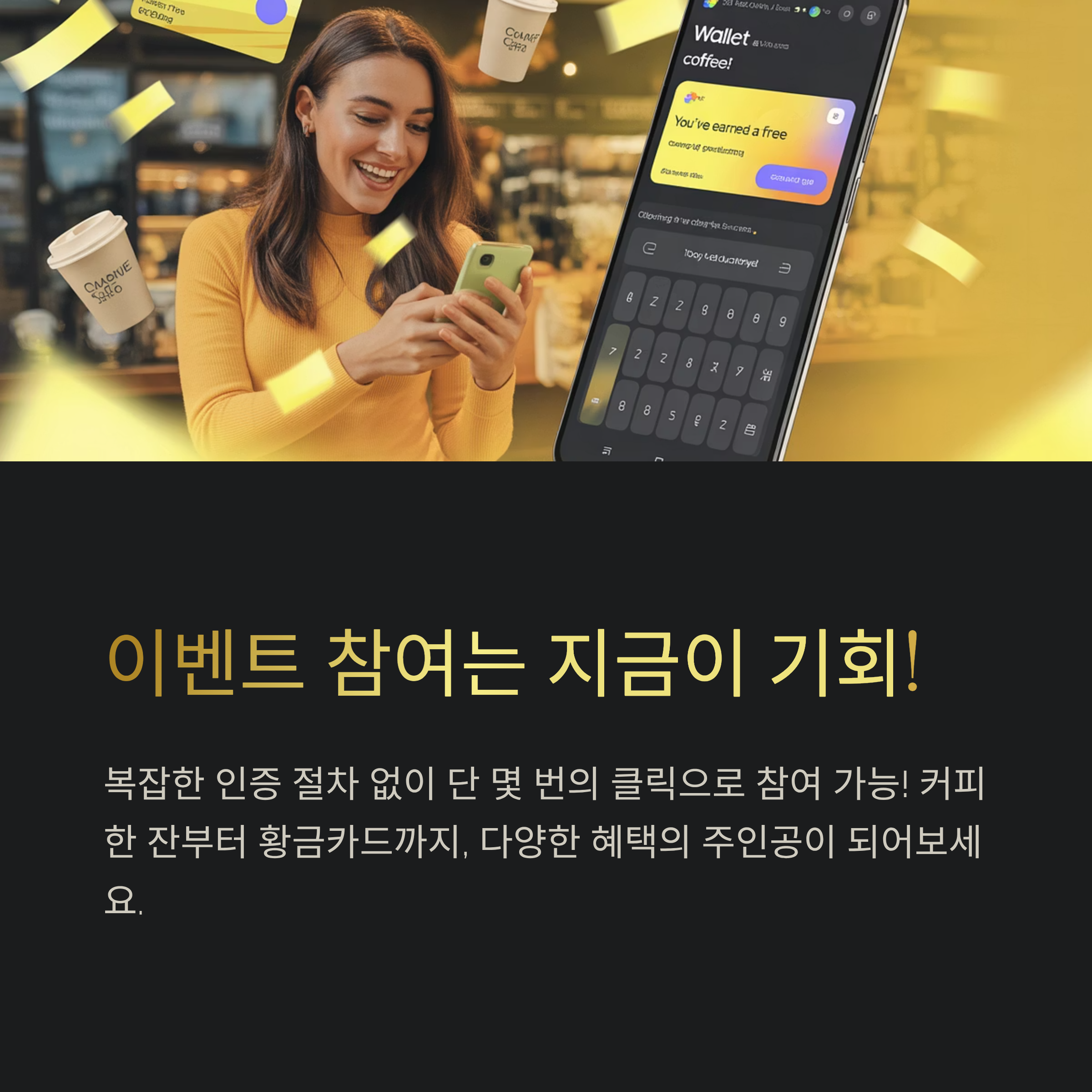 커피 한 잔, 소소한 기프티콘, 그리고 황금카드의 주인공이 될 수 있는 기회까지!
