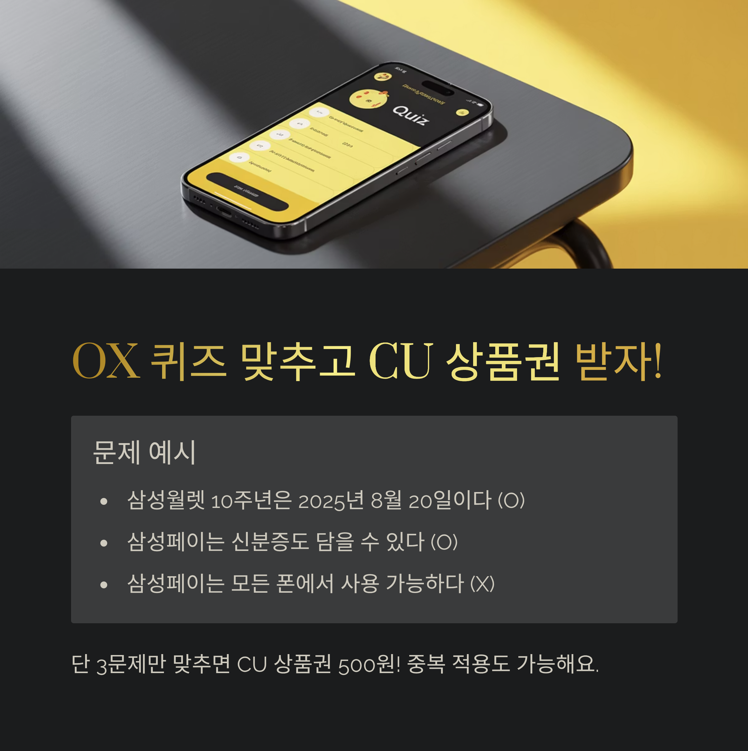 | OX 퀴즈 이벤트 | 3문제 OX 퀴즈 풀기 | CU 모바일 500원 쿠폰 |