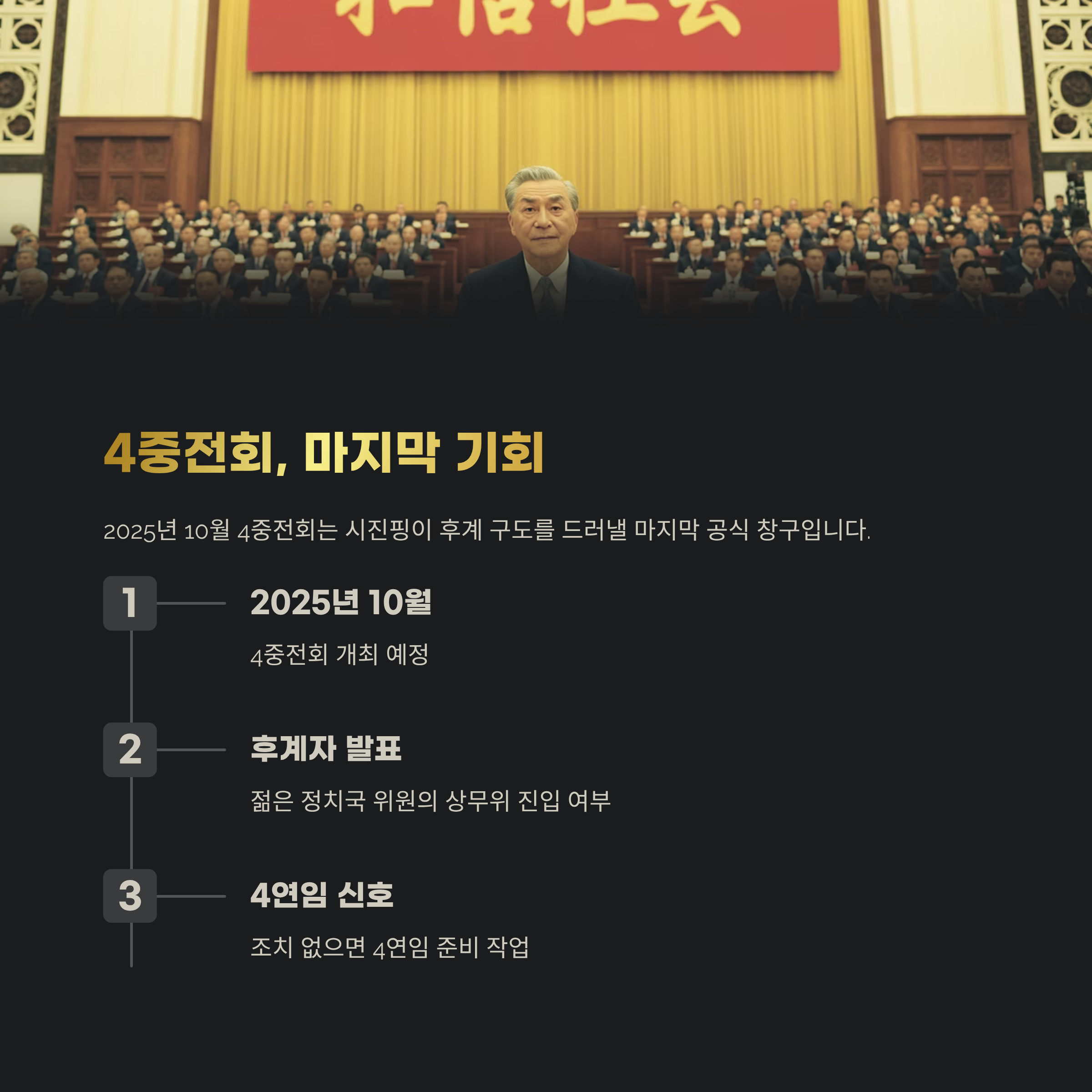 2025년 10월로 예정된 4중전회는 시진핑이 후계 구도를 드러낼 수 있는 마지막 공식 창구입니다. 이 자리에서 젊은 정치국 위원이 상무위에 진입한다면, 권력 이양을 준비하는 신호일 수 있습니다. 그러나 아무런 조치가 없다면 4연임을 위한 사전정지 작업일 가능성도 큽니다.