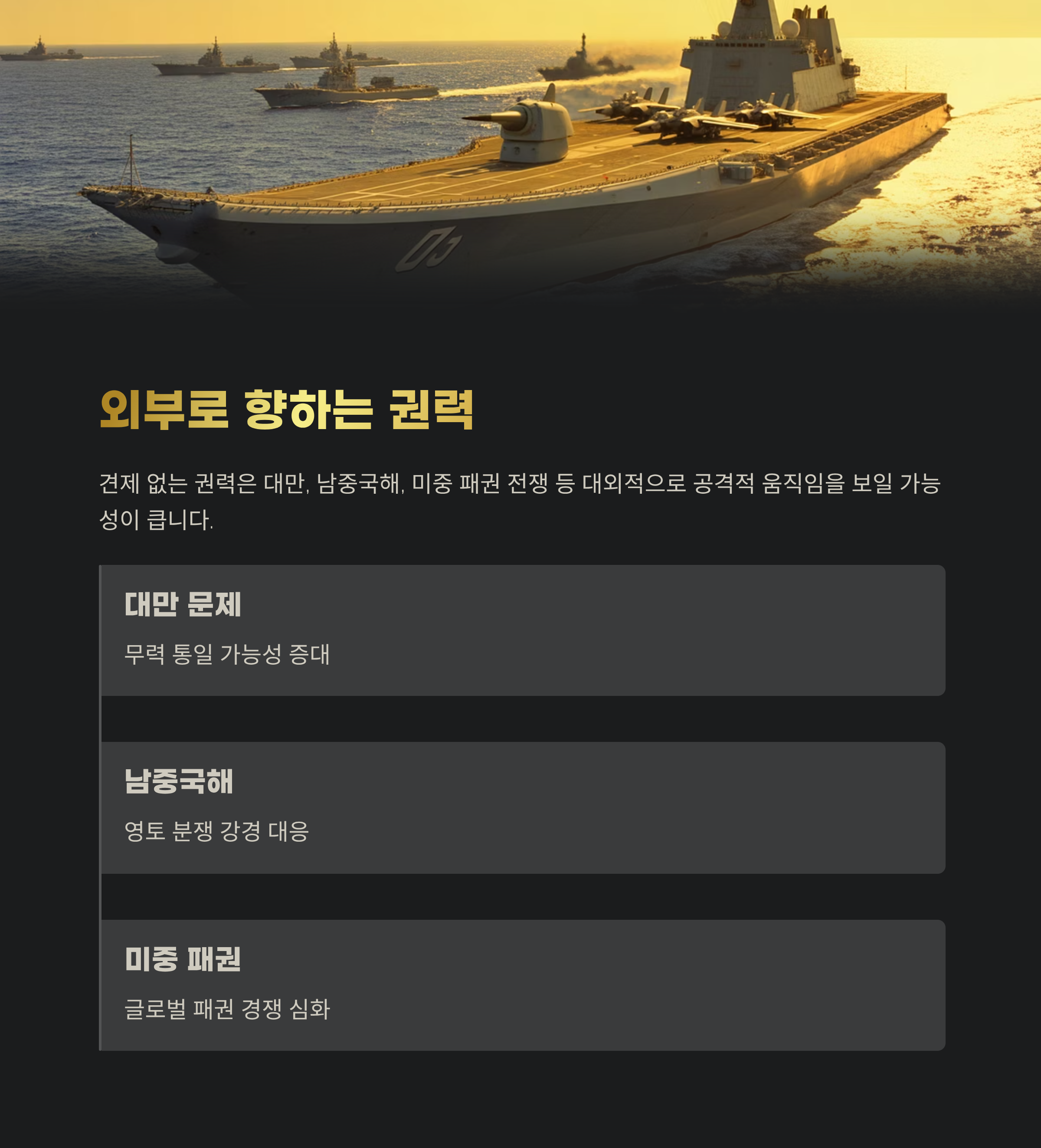 견제 없는 권력은 외부로 향할 가능성이 큽니다. 대만 문제, 남중국해 갈등, 미중 패권 전쟁은 시진핑 장기 집권 체제의 대외 변수입니다. 내치가 안정되었을 때, 중국이 외교·군사적으로 보다 공격적인 움직임을 보일 가능성도 배제할 수 없습니다.