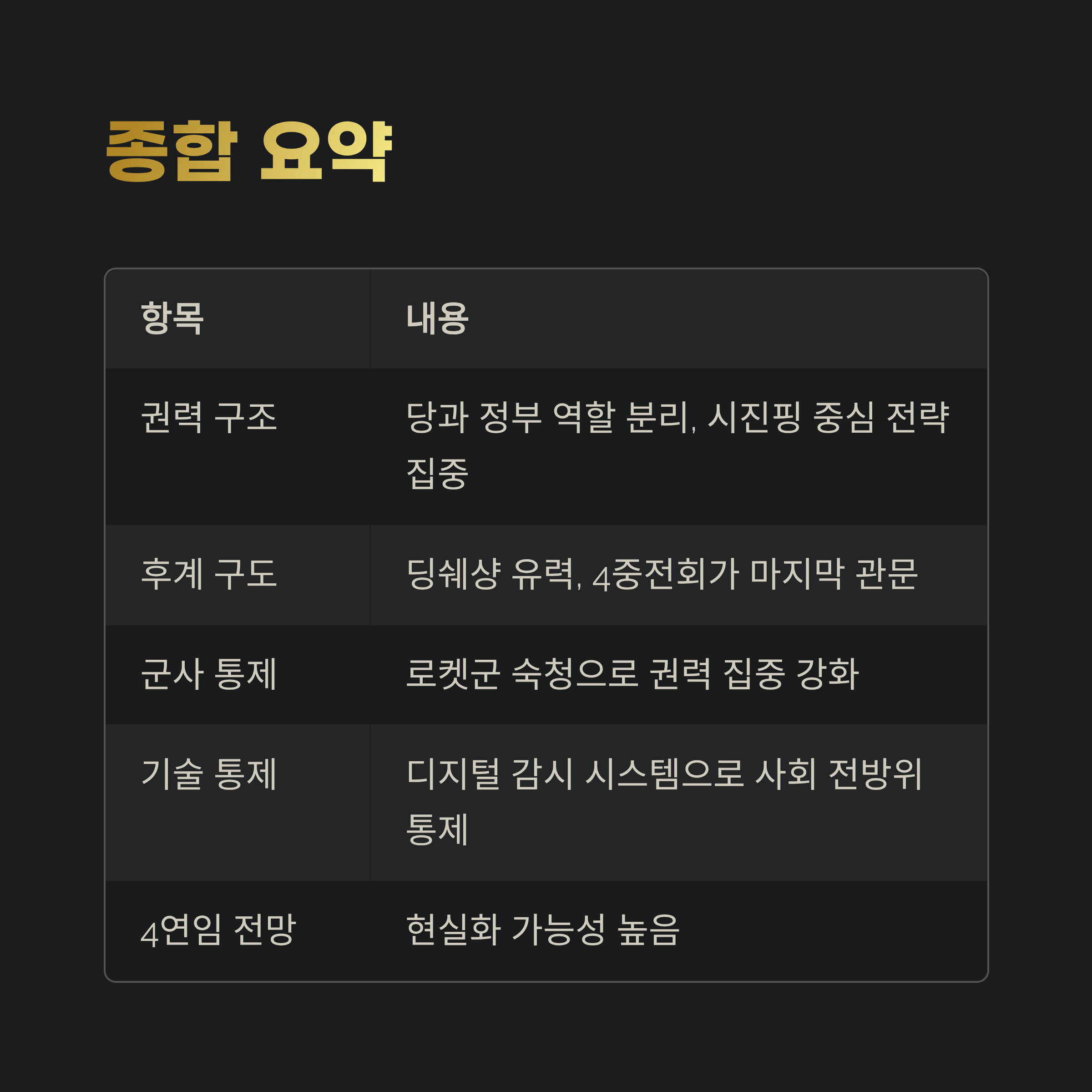 | 4연임 전망 | 현실화 가능성 높음, 조기 후계자 발표 없을 시 확정적 |