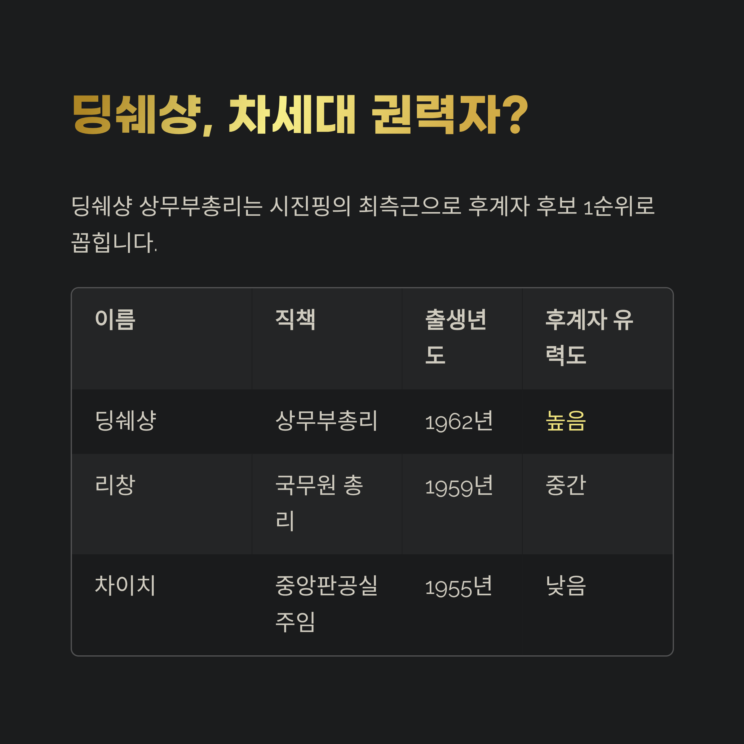 | 후계 구도 | 딩쉐샹 유력, 4중전회가 마지막 관문 가능성 있음 |