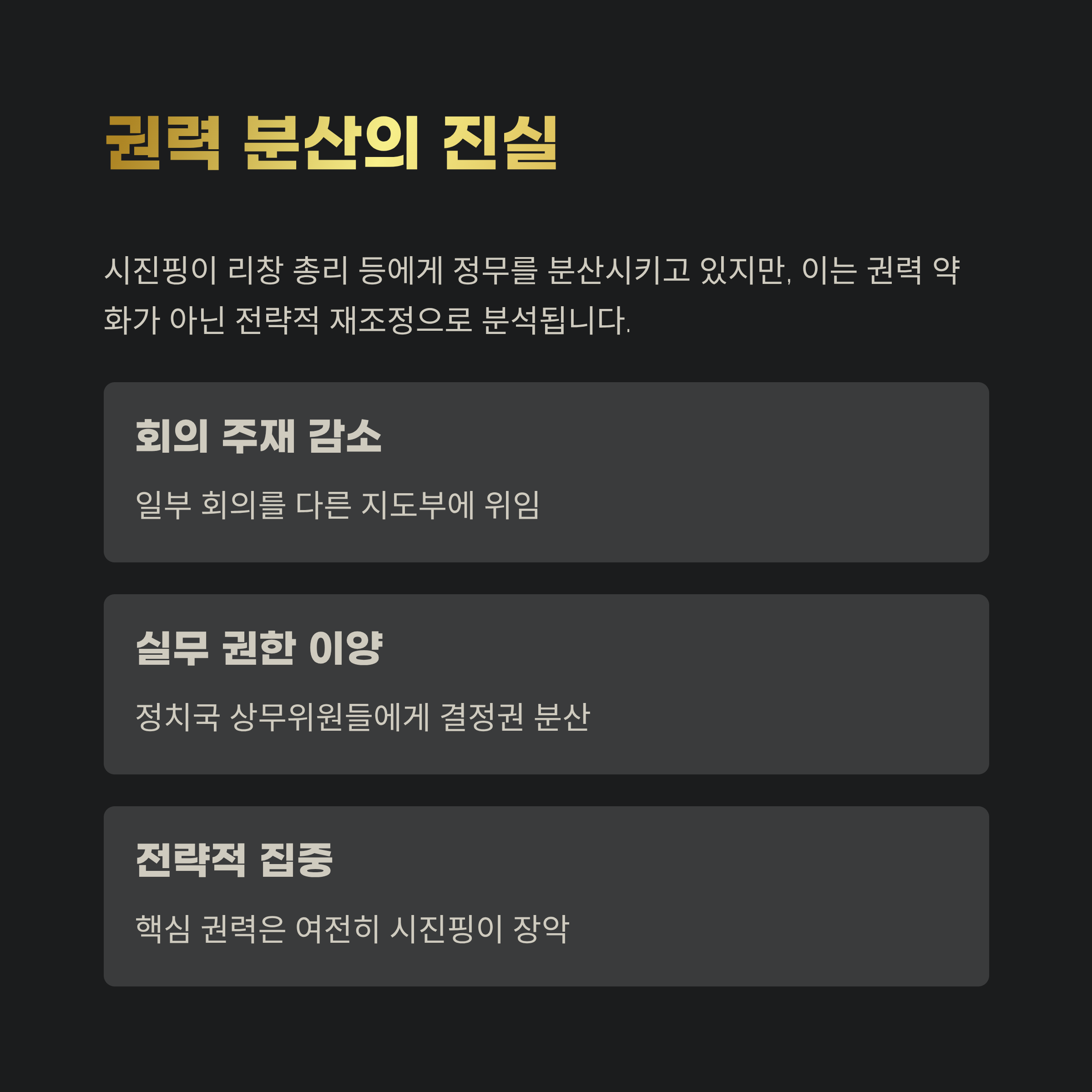 최근 시진핑 주석은 리창 총리를 비롯한 정치국 상무위원들에게 정무를 분산시키고 있습니다. 회의 주재 빈도가 줄고, 일부 실무 결정권이 이들에게 넘어갔습니다. 그러나 이는 권력 약화가 아닌 전략적 재조정이라는 분석이 유력합니다.