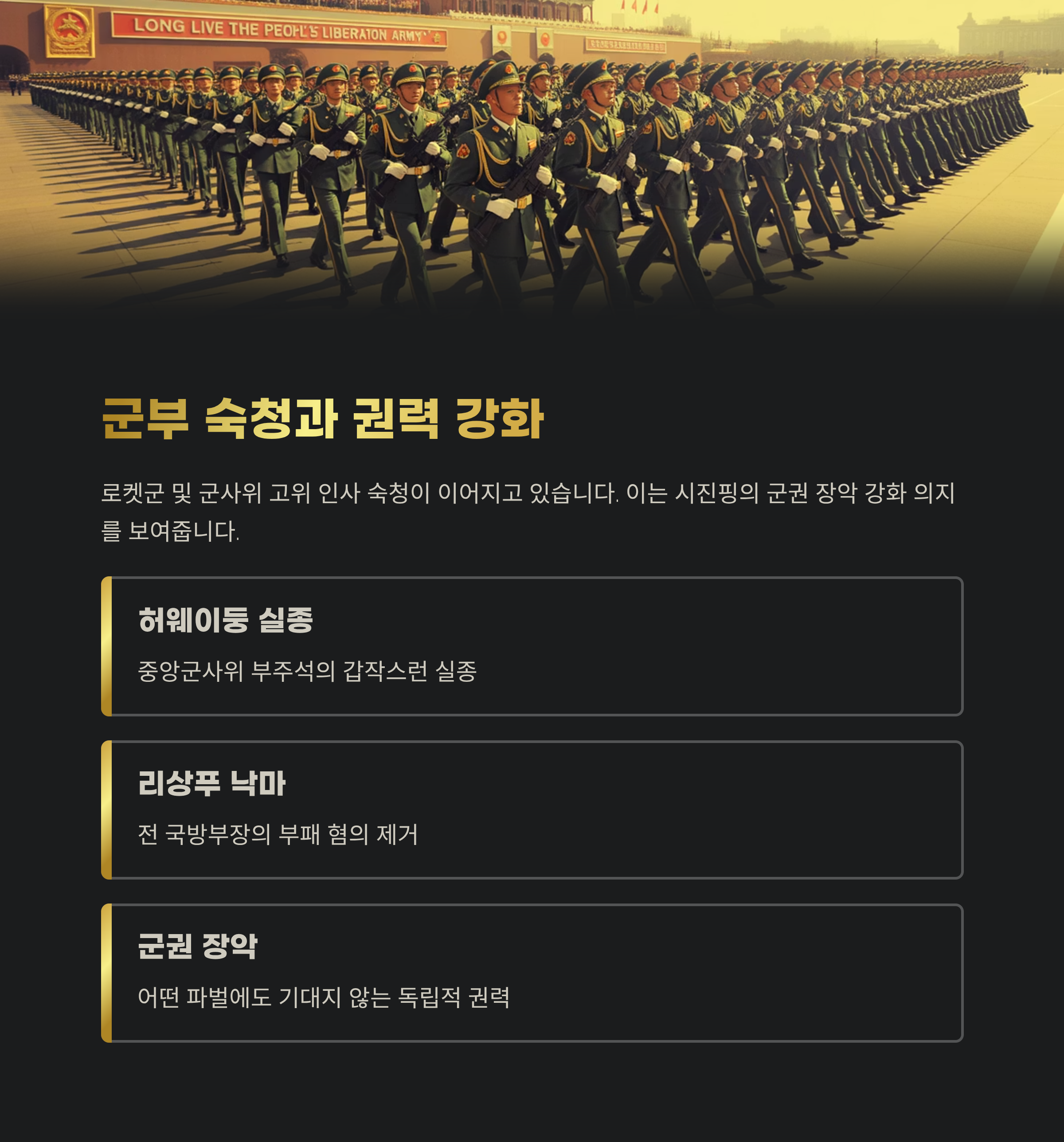 최근 로켓군 및 군사위 고위 인사에 대한 숙청이 이어지고 있습니다. 허웨이둥 중앙군사위 부주석의 실종, 리상푸 전 국방부장의 낙마 등은 단순한 부패 척결이 아닙니다. 시진핑의 군권 장악 강화이자, 어떤 파벌에도 기대지 않겠다는 의지로 풀이됩니다.