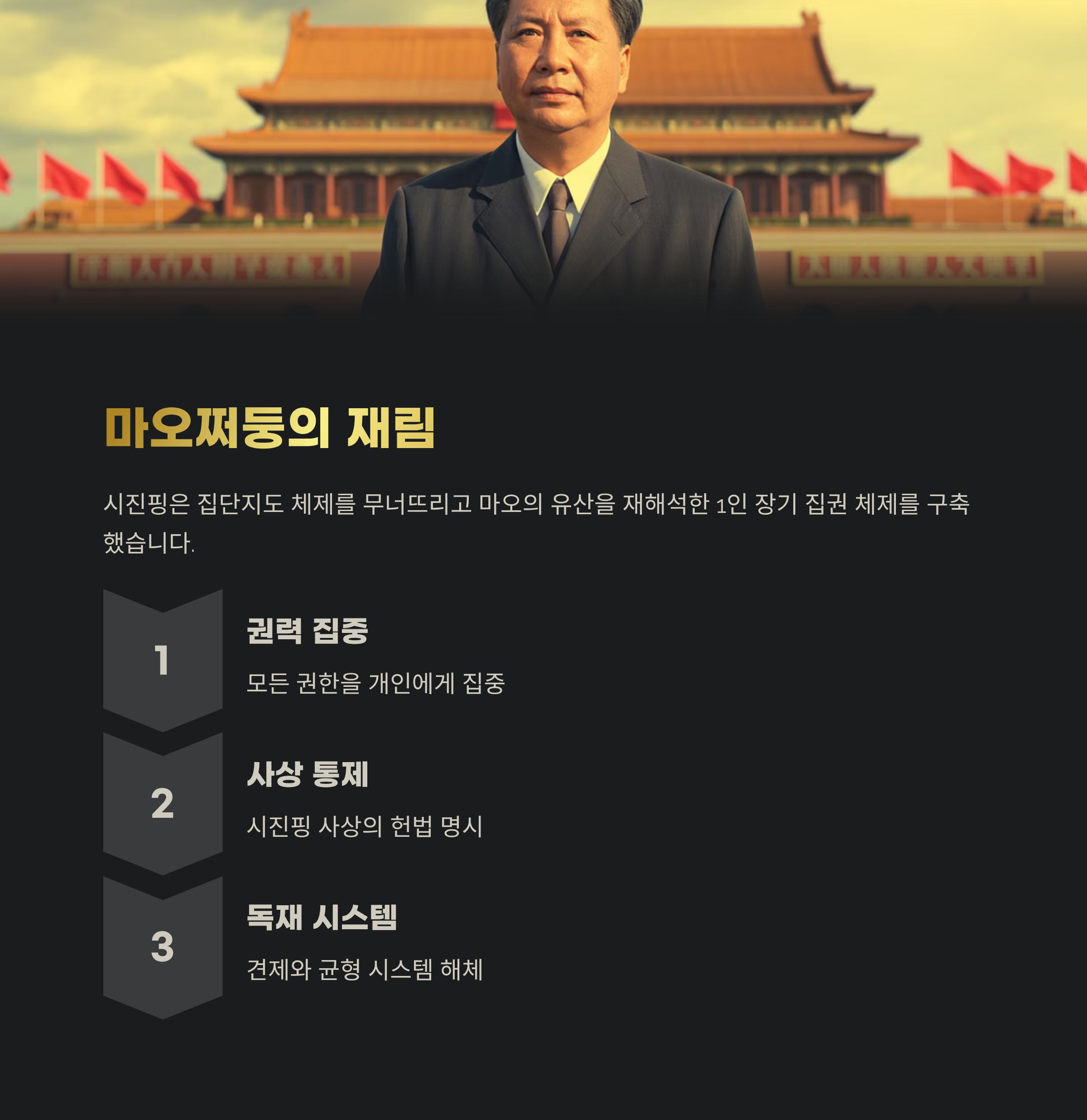 마오쩌둥 사후 중국은 집단지도 체제를 유지해왔지만, 시진핑은 이를 무너뜨렸습니다. 권력 집중, 사상 통제, 후계 구도 미지정, 독재 시스템 구축 등은 과거 마오의 유산을 재해석한 결과입니다. ‘1인 장기 집권’은 이미 현실이 되었고, 향후 10년 이상 그 체제가 유지될 가능성도 존재합니다.