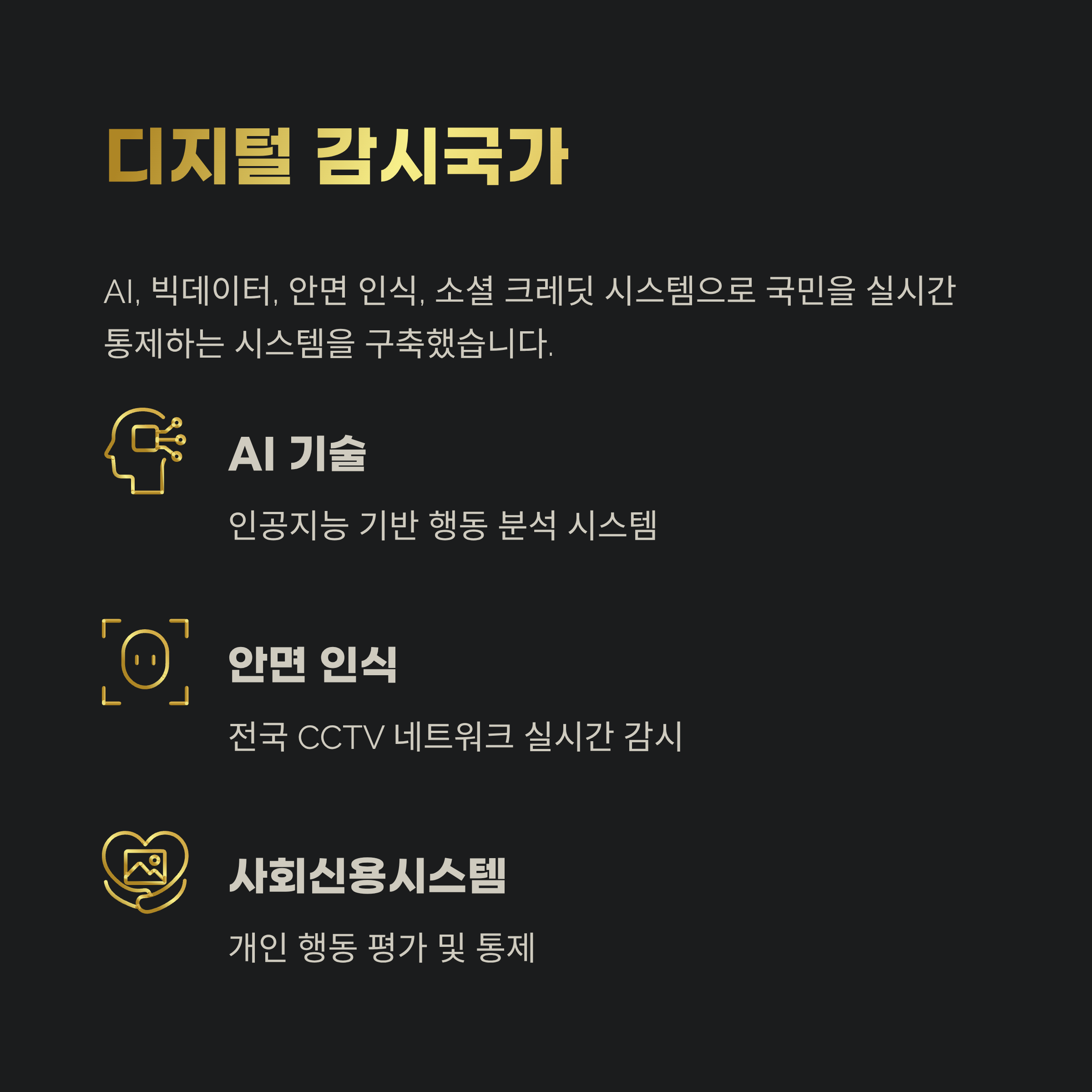 | 기술 통제 | 디지털 감시 시스템 구축, 사회 전방위 통제 실현 |