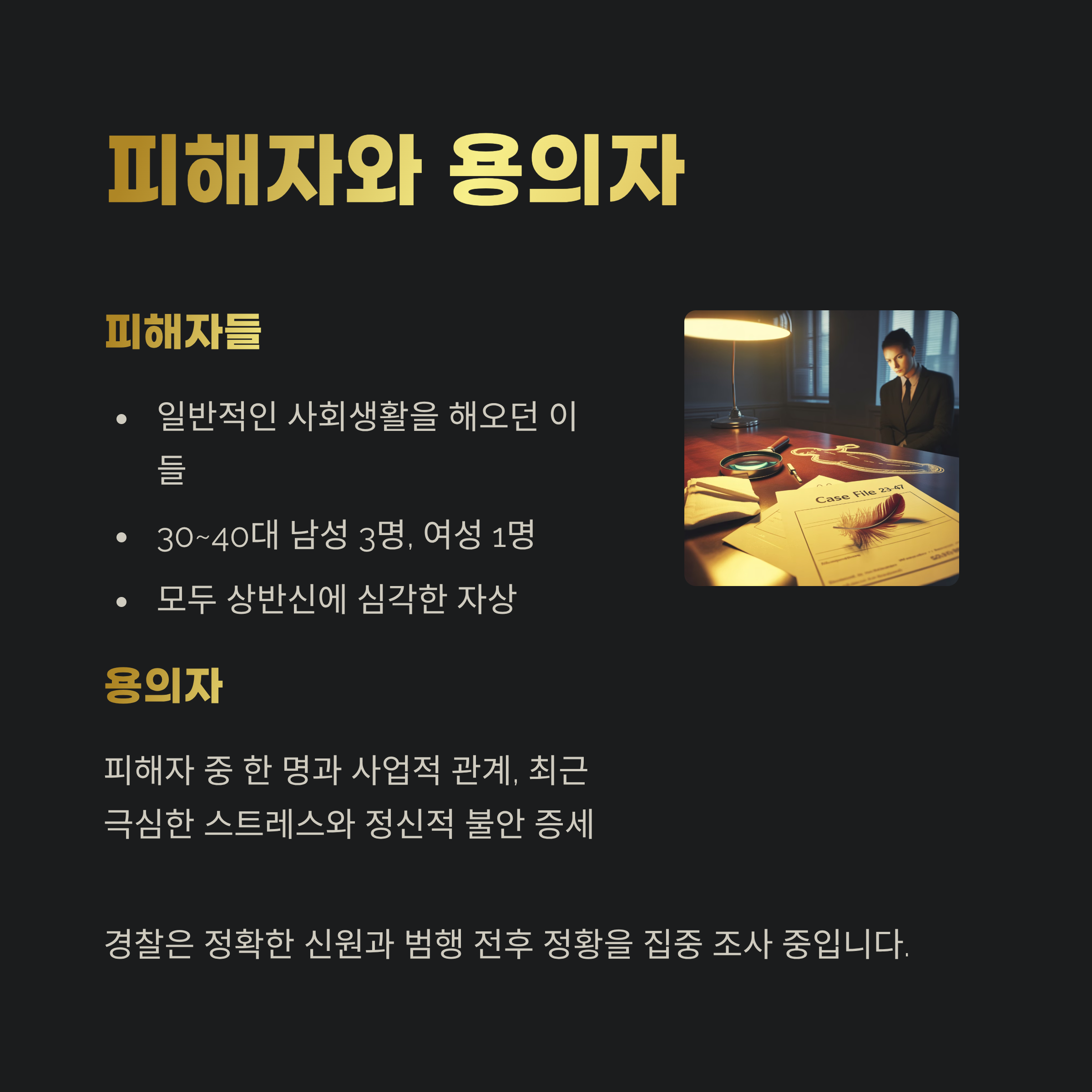 사망한 피해자들과 중상자 모두 일반적인 사회생활을 해오던 이들로 전해졌습니다. 용의자 역시 피해자 중 한 명과 사업적 혹은 친분 관계가 있었던 인물로, 최근 극심한 스트레스와 정신적 불안 증세를 보였다는 주변인의 진술이 나오고 있습니다.