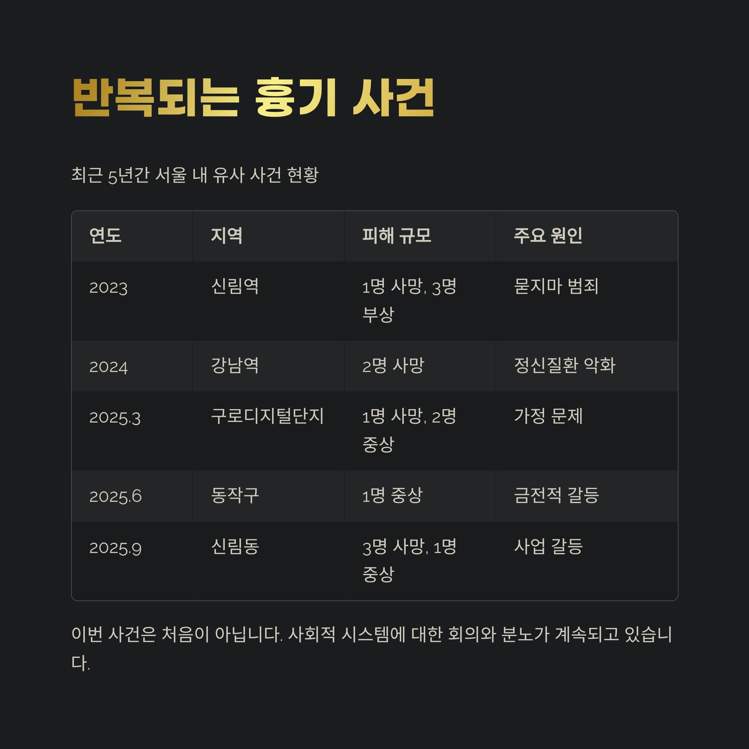 표로 최근 5년 간 서울 내 유사 사건을 정리해봤습니다.