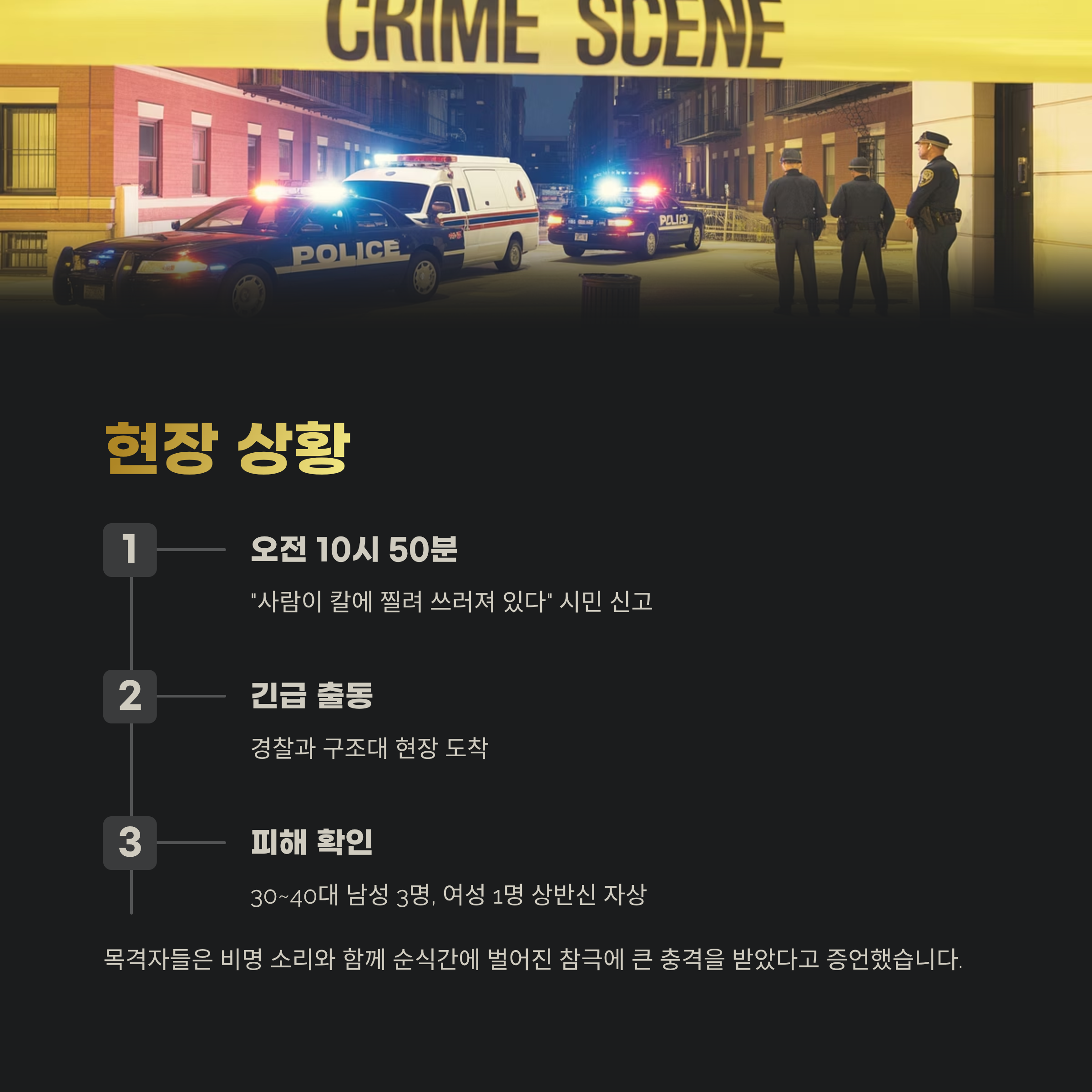 현장에선 오전 10시 50분경 "사람이 칼에 찔려 쓰러져 있다"는 시민의 신고로 경찰과 구조대가 긴급 출동했습니다. 피해자는 30~40대 남성 3명과 여성 1명으로, 모두 상반신에 심각한 자상을 입은 상태였죠. 그중 3명은 사망했고, 1명은 중상을 입고 치료 중입니다.