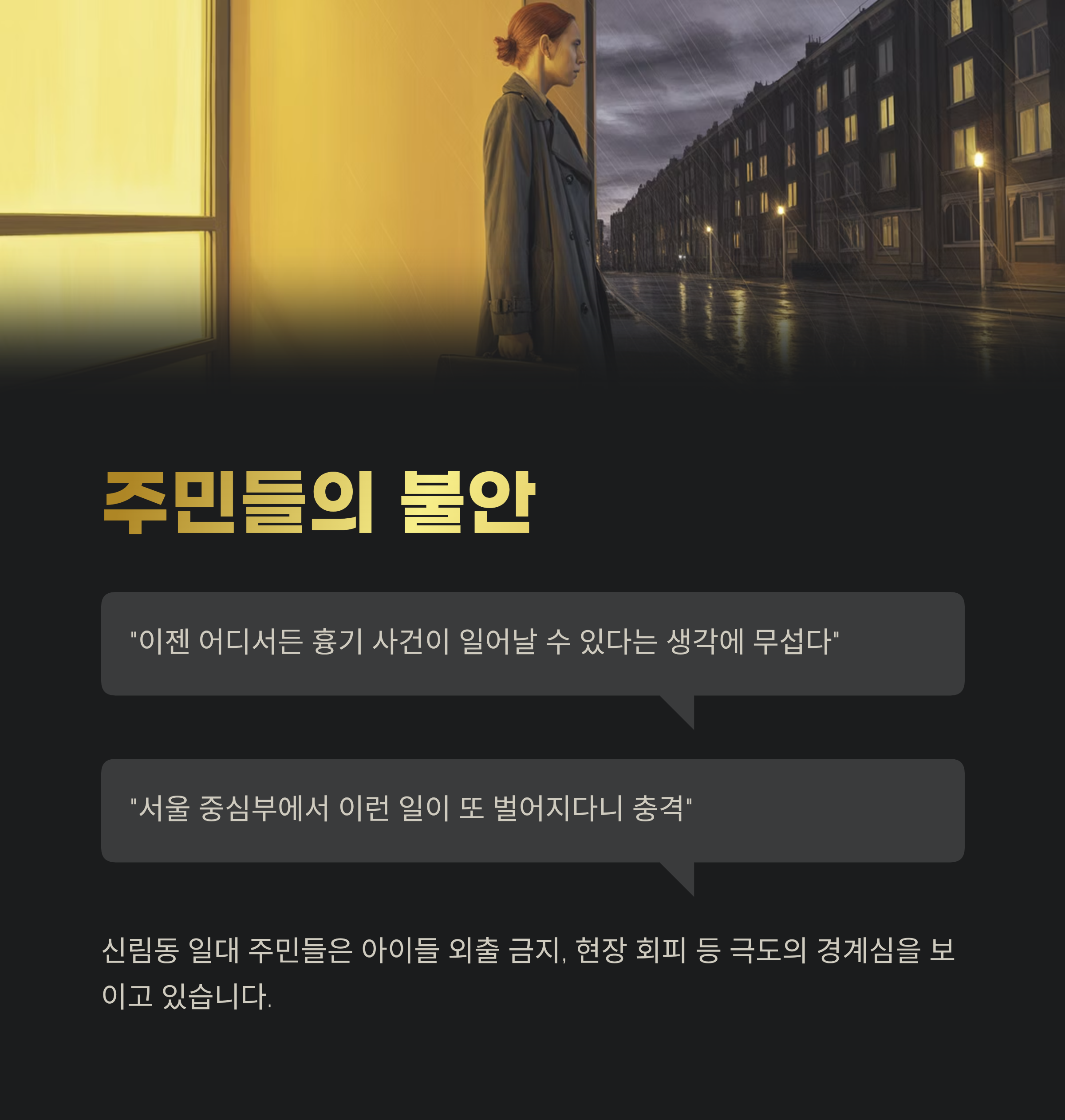 사건이 벌어진 후, 신림동 일대의 주민들은 깊은 불안감에 휩싸였습니다. 일부는 아이들의 외출을 금지하거나 현장을 아예 피하는 등 극도의 경계심을 보이고 있습니다.