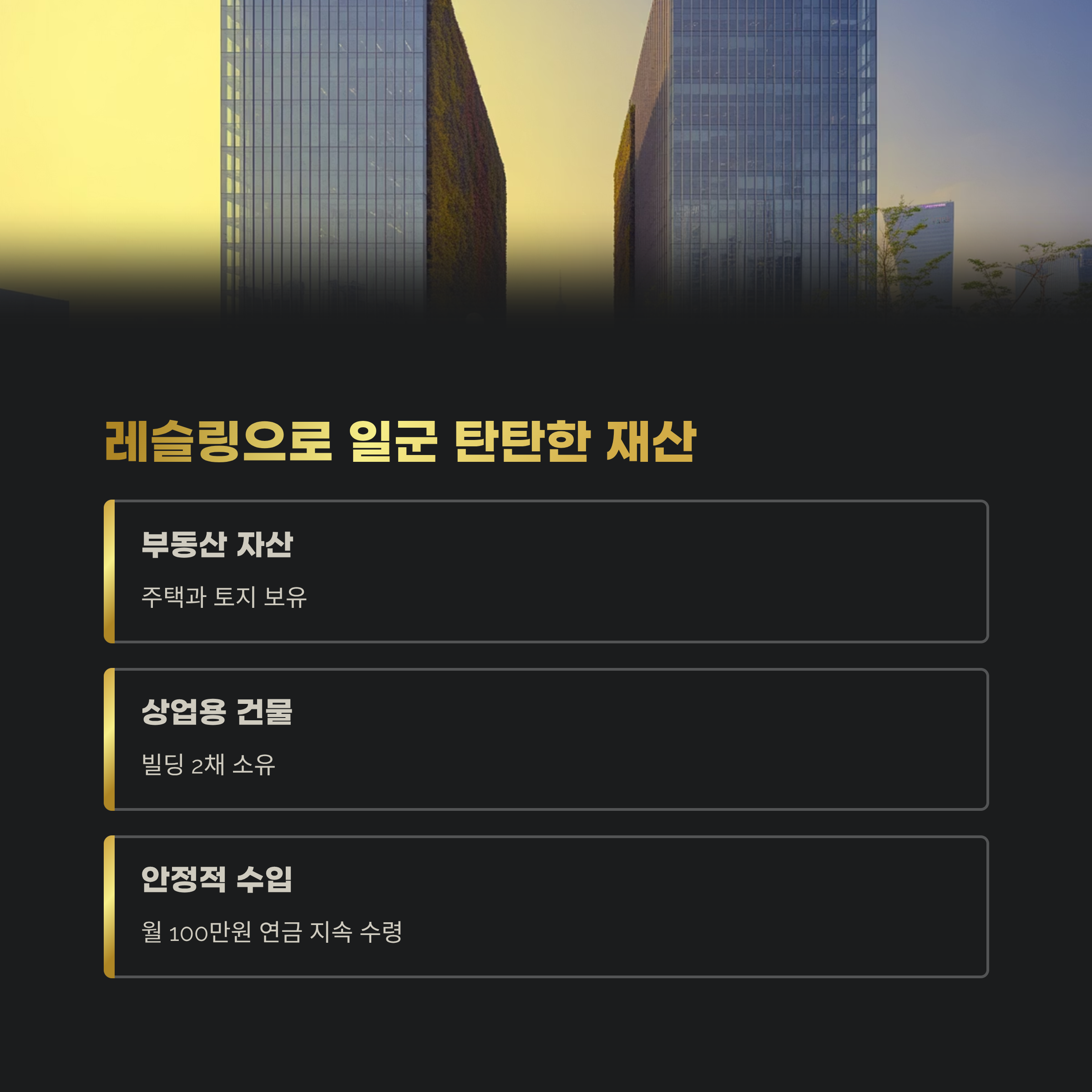 | 연금 | 월 100만 원, 누적 10억 원 이상 수령 |