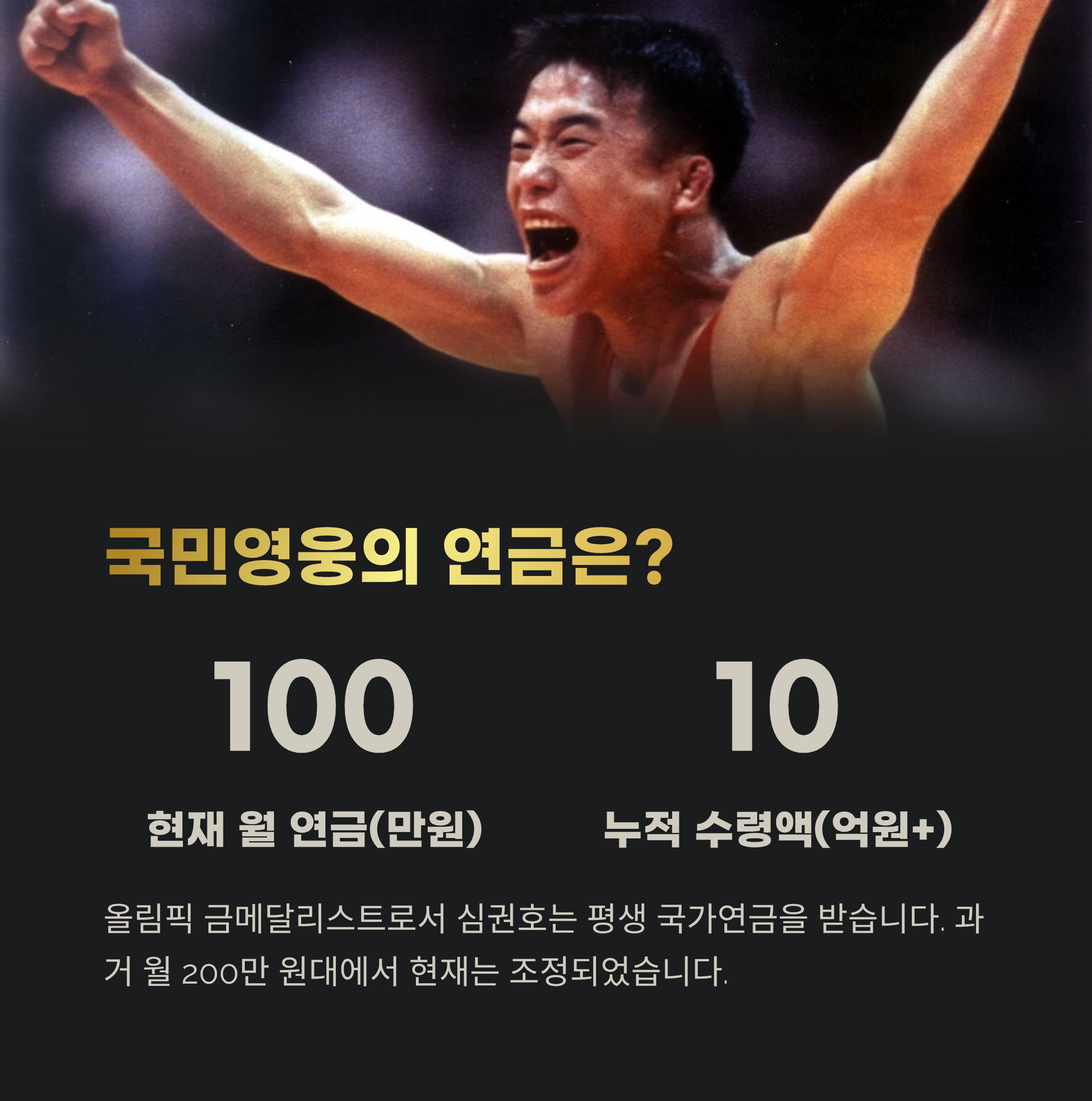 올림픽 금메달리스트로서 심권호는 국가에서 지급하는 연금을 평생 받습니다. 제도 변경 전엔 월 200만 원대였고, 현재는 약 100만 원으로 조정되었지만, 누적 수령액은 약 10억 원 이상으로 추산되고 있습니다.