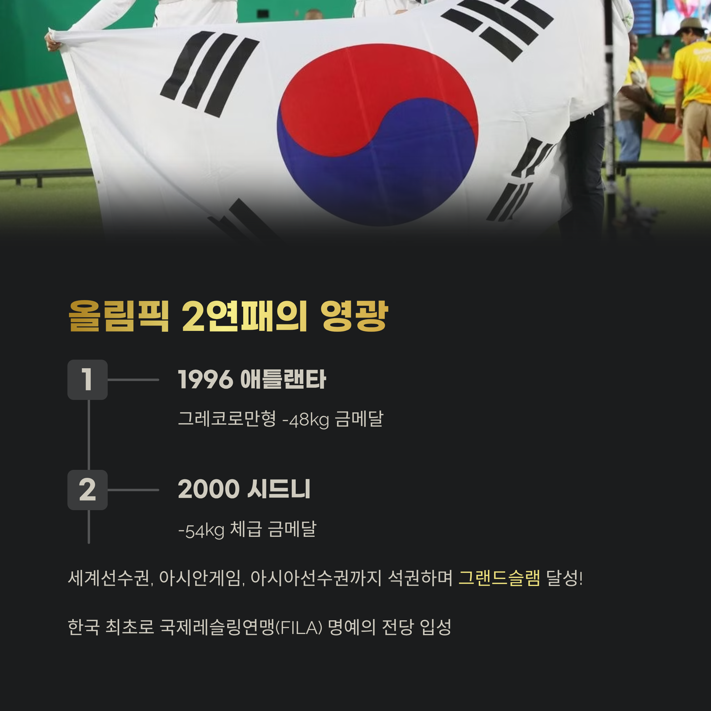 심권호는 1996년 애틀랜타 올림픽에서 그레코로만형 -48kg 금메달을, 이어 2000년 시드니 올림픽에서는 -54kg 체급에서 금메달을 따내며 레슬링 역사상 드문 올림픽 2연패를 기록했습니다. 여기에 세계선수권, 아시안게임, 아시아선수권까지 석권하며 ‘그랜드슬램’을 달성한 인물입니다. 한국 최초로 국제레슬링연맹(FILA) 명예의 전당에도 이름을 올렸죠.