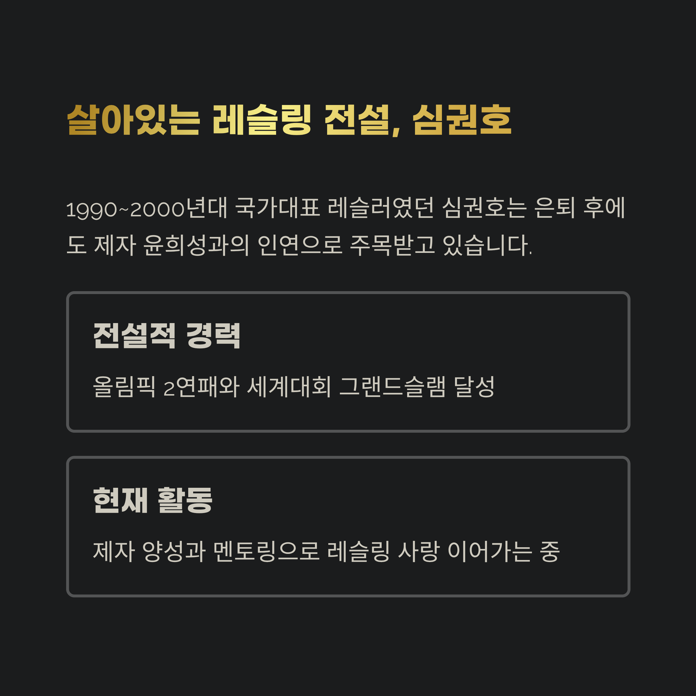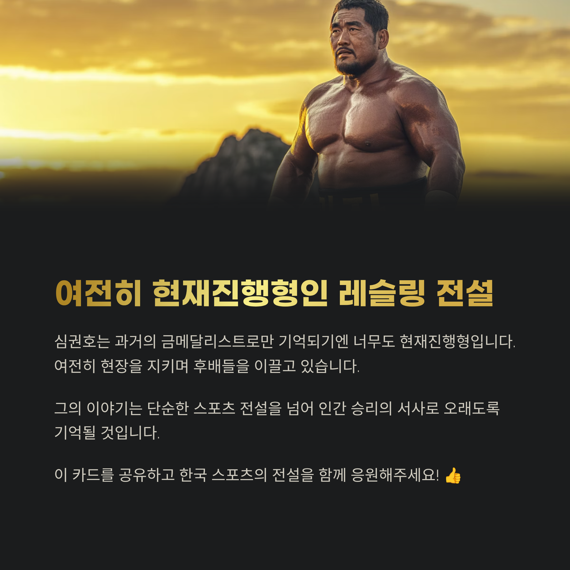 심권호는 과거의 금메달리스트로만 기억되기엔 너무도 현재진행형입니다. 여전히 현장을 지키며 후배들을 이끌고 있고, 레슬링이라는 종목을 통해 한국 스포츠계에 남긴 영향력은 세월이 지나도 빛이 바래지 않습니다. 그의 이야기는 단순히 스포츠의 전설을 넘어, 인간 승리의 서사로도 오래도록 회자될 것입니다.