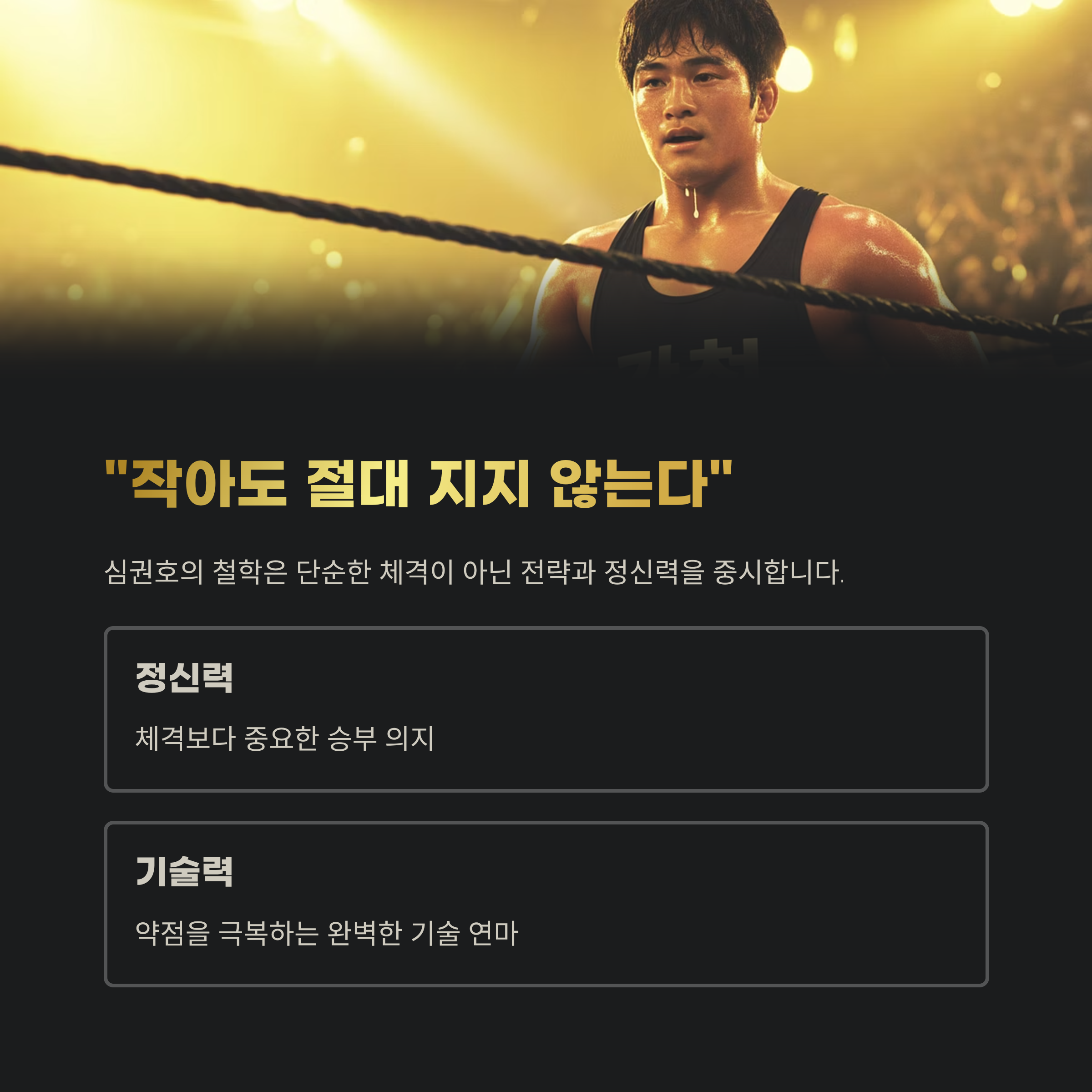 레슬링 기술과 체급 싸움은 단순한 근력 이상의 전략과 정신력을 필요로 합니다. 심권호는 항상 "작아도 절대 지지 않는다"는 말을 입버릇처럼 하며 훈련에 임했고, 이 철학은 제자들에게 고스란히 전수되고 있습니다.