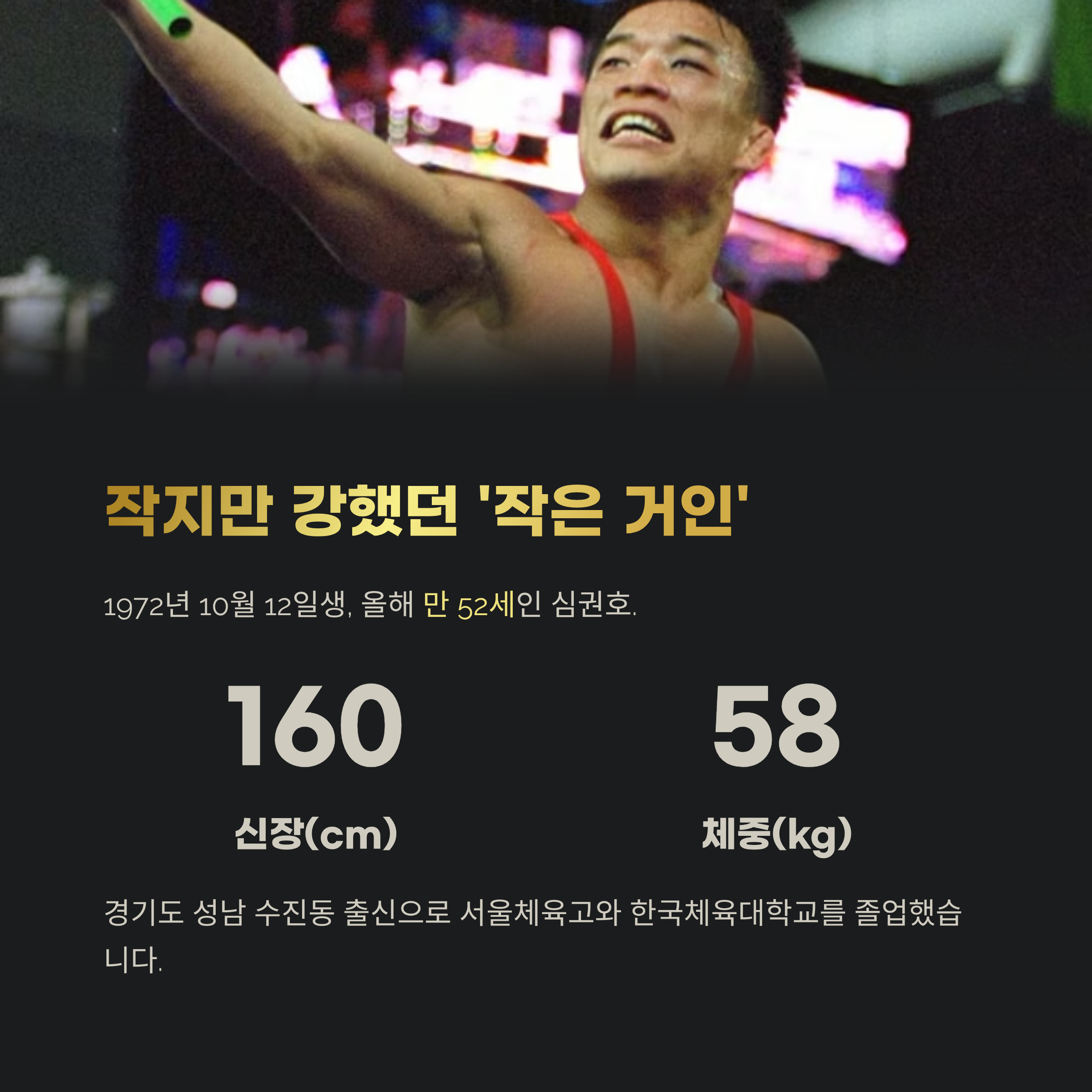 1972년 10월 12일생, 올해 만 52세인 심권호는 경기도 성남 수진동에서 태어났습니다. 키는 약 160cm, 체중은 58kg 정도였지만, 체급 레슬링에서는 그 어떤 거구도 두렵지 않은 ‘작은 거인’이었습니다. 서울체육고등학교와 한국체육대학교를 졸업하며 본격적으로 국가대표 길을 걷게 되었죠.