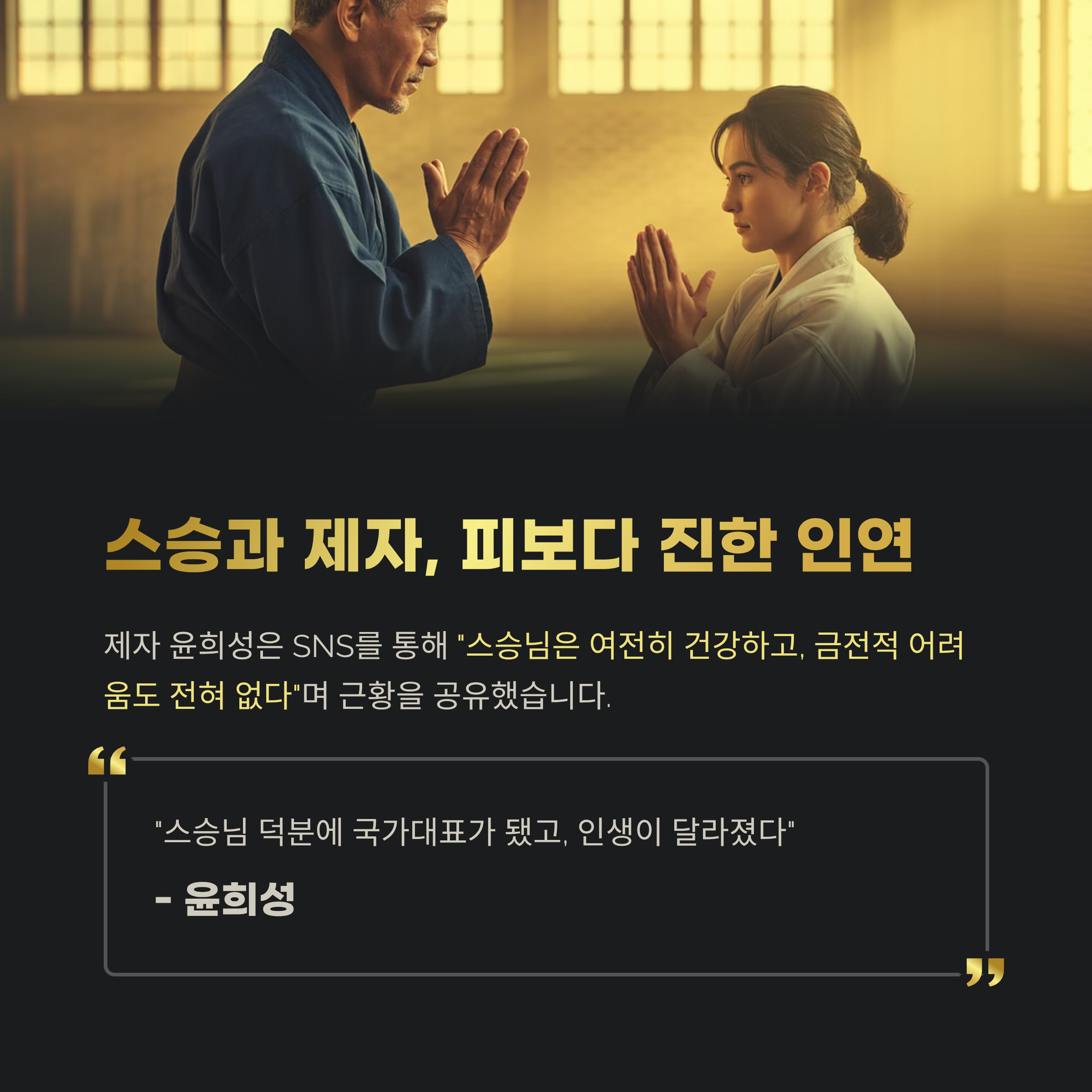 윤희성은 과거 “스승님 덕분에 국가대표가 됐고, 인생이 달라졌다”며 고마움을 표현하기도 했습니다.